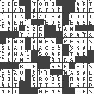 ACROSS 1. Frozen water 4. "Corrida" creature 8. Nonscientific branch of learning 11. Thick slice 13. Remain 15. Born 16. Globular water bottle used in Asia 17. An organ shaped like a helmet 18. A blast of a horn 19. Incident 21. Begley and Asner 22. Relaxation 23. Nine, plus one 24. Ending with capital 27. Scottish cap 29. On the rocks 30. Arguments over trivial matters 34. Followers of ems 36. Afresh 39. Mexican monetary units 40. Narrow board 41. Shoestrings 43. Three-handed card game 44. Lessep's creation 46. Fly high 47. Small amount or degree 48. Lacking in sense or substance 49. Teases 51. Of large size 53. Compass dir. 54. Raised railways 57. Son of Isaac 60. Choose 63. Relating to the nose 65. Deli pickle 66. Eat (away) 69. Immoral or dissolute person 70. Cuckoo 71. Settings 72. Supplemented with great effort 73. Was introduced to 74. Not women's 75. Big collection agency DOWN 1. Small island 2. Garlic unit 3. Ingested 4. Label 5. Chief or king in Benin or Nigeria 6. Cause heat under the collar 7. Wrote a lyric poem 8. Small Philippine buffalo 9. Vintage cars 10. False hair 12. Bar 14. 90 degrees 18. Storms 20. Nervous spasm 25. Ardor 26. Ferber et al. 28. Viper 29. Byzantium, centuries later 31. "____ silly question..." 32. Frog relative 33. Fast jet (abbr.) 34. Style 35. Grandmother 37. Environmental prefix 38. Erodes 40. _-fi 42. Indian titles of respect 45. Luau accessory 50. Benjamin's nick name 52. Travels 54. 1973 Nobel Price Winner (Physics) Leo 55. Member of a famous L.A. basketball team 56. Bobsleighs 57. Dutch treat 58. Trig term 59. Set down 61. Demure 62. Carry 64. "We ___ not amused" (Victoria) 67. Lair 68. Curvy letter