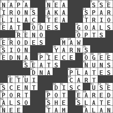 ACROSS 1. California wine valley 5. Teachers' org. 8. Compass dir. 11. Removes the wrinkles 13. Alias (abbr.) 14. Practice fight 15. Pale purple color 16. Beverage made from leaves 17. Musical group of three 18. Erode 19. Lyric poems 21. Purposes of endeavors 22. Western Nevada city 24. Elects 25. Eats (away) 27. Informal term for the mouth 29. The Jewish people; Israel 30. Tall tales 32. Pulitzer Prize-winning author Ferber 33. Part 35. Double curve, resembling the letter S 39. Theater features 41. Religious women 42. Heredity factor (abbr.) 43. Food holders 45. Needle case 48. Haul 49. Odor 50. Plate 52. Purpose 55. Left side of a ship or aircraft 56. Plant holder 57. Having ears or earlike features 59. In addition 60. A female animal or person 61. Schedule 62. Born 63. Scottish cap 64. ____ Jay Lerner DOWN 1. The longest river in the world 2. Operatic vocal solo 3. Coward 4. Santa ___, CA 5. Nathan's nickname 6. Supplements with great effort 7. American Automobile Association (abbr.) 8. Small fatty European fish 9. Travels by water 10. Greek god of love 12. Biscuitlike quick bread 14. Constrict 20. Two (Sp.) 21. Woman's formal wear 23. Ferber et al. 25. Compass dir. 26. To free from 27. Apple computer (short form) 28. "We ___ not amused" (Victoria) 30. It is so 31. Underwater navigation system 33. Baking dish 34. Call ___ day 36. From the throat 37. Compass dir. 38. Double-curved letter 40. Prepare for publication 43. Personal Computers (abbr.) 44. Shoestrings 45. Learning spot: Fr. 46. Laconic 47. To (old English) 49. Connect, as a bridge 50. Capital of the state of Qatar 51. A whole individual unit 53. Stalk of a moss capsule 54. Paradise 56. Pacific Standard Time (abbr.) 58. Chicken ___ king