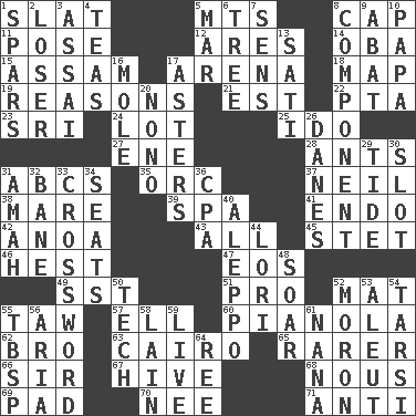 ACROSS 1. Narrow board 5. Mountains (abbr.) 8. Head covering 11. Introduce or present, as a question 12. Ancient Greek god of war 14. Chief or king in Benin or Nigeria 15. Indian state 17. Sports stadium 18. Atlas unit 19. Thinks logically 21. Eastern Standard Time (abbr.) 22. Parent Teacher Assoc. 23. _ Lanka 24. Car dealer's back yard 25. Wedding promise 27. Compass dir. 28. Pismires 31. Lettered men learn these first 35. The grampus (Milton) 37. Famous astronaut Armstrong 38. Female horse 39. Health resort 41. Inside; within (prefix) 42. Small Philippine buffalo 43. 100% 45. Proofreading order 46. Behest 47. Greek goddess of the dawn 49. Fast jet (abbr.) 51. Adept person 52. Floor protector 55. The 23rd letter of the Hebrew alphabet 57. Pipe bend 60. Player piano 62. Sis' sibling 63. Capital of Egypt 65. More uncommon 66. Title for a knight 67. Hub of activity 68. Horse sense 69. Groovy apt. 70. Born 71. Opposed to DOWN 1. Practice fights 2. Failure 3. Slender Brazilian palm 4. Beverages made from leaves 5. Third mo. 6. Family _ (genealogy) 7. Elected reps. 8. Part 9. Blind as ____ 10. Dad 13. Suttee (variant) 16. Undercover agent 17. Michaelmas daisies 20. Words to Nanette 26. Natives or inhabitants of Denmark 29. Event that recurs at intervals 30. Groove 31. Housemaid 32. Object of repulsion 33. What you're doing now 34. Theater features 36. Tax preparer (abbr.) 40. City in Syria 44. Australian parrot (variant) 48. Fly high 50. Technology 52. Person of subnormal intelligence 53. Eskimo relative 54. Tarsus (plural) 55. Cook's measure (abbr.) 56. Operatic vocal solo 58. (Had) reclined 59. Not recorded 61. Nanny 64. To riddle