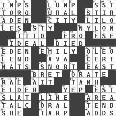 ACROSS 1. Naughty children 5. Mass 9. Fast jet (abbr.) 12. "Corrida" creature 13. Mountain range 14. Use a swizzle stick 15. Arabian gulf 16. Municipality 17. _ and Stitch 18. French article 19. Filthy place 21. High-strength synthetic material 22. "Tell ____ the Marines!" 24. Back 26. Compass dir. 27. Standard of perfection 28. Passed on 29. Genesis locale 30. Poet Dickinson 32. Margarine 36. Grant temporary use of 37. Actress Gardner 38. Sure thing 39. Floor protectors 40. Derisive sound 42. Compass direction 43. Cy Young winner Saberhagen 44. Declaim 46. Actress Charlotte 49. Small island 50. Hyperbolic tangent 51. A person who is older than you are 53. Slangy assent 54. Eastern Standard Time (abbr.) 57. Narrow board 58. Citrus frut 61. Length times width 62. Baby powder 63. Taken by mouth 64. Be inclined (to) 65. A female animal or person 66. Canvas cover 67. Sums up DOWN 1. Slanted text style (abbr.) 2. Method 3. Elected leader of a country 4. Male offspring 5. "I Love _" 6. RI univ. 7. Floor covering 8. Apply oneself diligently 9. Vertical member of a panel or frame 10. Grain storage towers 11. Marketplace scale 14. Playfully artful 19. R.R. building 20. Lacquered or enameled metalware 21. Allow head to fall sleepily 23. Is inclined (to) 24. Of or pertaining to a thread or threads 25. Marina Del _, California 27. The main thing one is thinking about 28. A piece of turf (Scot.) 29. Shade tree 31. French painter Edouard 32. Sea 33. Resembling or made to resemble leather 34. Celtic language 35. Baseball player Mel 40. _ Lanka 41. Carry 43. Long, evenly shaped piece 45. Hit sharply and swiftly 46. Musical pauses 47. Assad's deity 48. Peak District village in England 52. And so on (abbr.) 53. Sharp bark 55. Post 56. Small boys 58. Car dealer's back yard 59. Retirement account (abbr.) 60. Impair 61. _ moment's notice (2 wds.)