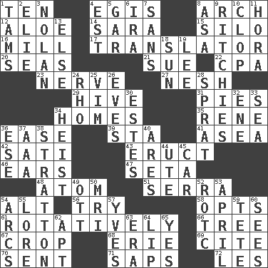 ACROSS 1. Nine, plus one 4. Armor plate that protects the chest 8. Bowlike part 12. _ vera 14. "Two Mules for Sister ____" 15. Grain storage tower 16. Place where flour is made 17. Interpreter 20. Oceans 21. Take to court 22. Tax preparer (abbr.) 23. Boldness 27. Tender 29. Hub of activity 31. Sliced desserts 34. Dwellings 35. French philosopher Descartes 36. Relaxation 39. R.R. building 41. Toward the sea 42. Suttee (variant) 43. Spew [out] 46. Hearing organs 47. Stalk of a moss capsule 48. Tiny particle 51. Father Junipero _ 54. Keyboard modifier key 56. Attempt to accomplish something 58. Elects 61. Producing rotation 66. Family _ (genealogy) 67. Riding implement 68. One of the Great Lakes 69. Quote 70. Emitted 71. Plant excrements 72. French article DOWN 1. Scottish caps 2. Writer Wiesel 3. Pitcher Ryan 4. Eastern Standard Time (abbr.) 5. Slender fish 6. Retirement account (abbr.) 7. Without 8. White ___ sheet 9. Actors Guy, Robert Welles, and Clint 10. Hoof sound 11. Israeli folk dance 13. Otherwise 18. Player for Phoenix 19. Area sheltered from the wind 24. 17th letter of the Greek alphabet 25. Zeal 26. Nights before holidays 28. Small fatty European fish 30. _____ Park, CO 32. Compass dir. 33. Ocean 34. Robbery 36. Compass dir. 37. Auto club (abbr.) 38. Ski resort town in Vermont 40. Ancient Greek god of war 44. Shoshoni 45. 4-wheeled motor vehicle 49. Baseball player Mel 50. Medical imaging device (abbr.) 52. College mil. group 53. Showery time 54. Curves 55. Old wives' tales, e.g. 57. Jacques Cousteau's middle name 59. Wig 60. Perceives with the eye 62. Fitting 63. Period 64. Mouth edge 65. Affirmative reply