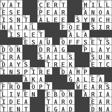 ACROSS 1. Large container 4. Foregone conclusion 8. Place where flour is made 12. Compass dir. 13. Lightbulb-shaped fruit 14. Small Philippine buffalo 15. Is not 17. Toward shelter 18. Synchronize (abbr.) 19. Brizilian seaport 21. Enemy 23. Title for a knight 24. Small island 26. According to 28. Son of Isaac 30. Cancels 34. Spanish title 37. To draw with force 39. Frolic 40. Retirement account (abbr.) 41. Travels by water 43. Player for Phoenix 44. 24-hour periods 46. Long journey 47. And so on (abbr.) 48. Motivate 51. Moist 54. Alias (abbr.) 55. An organ shaped like a helmet 58. From 61. Choose 63. Puts on (as clothing) 65. Make or become more lively 67. Inky black, to poets 71. Roberta Peters solo 72. It may be bright or harebrained 73. Edible starchy tuberous root 74. Hearing organ 75. Portable shelter 76. Mild oath 77. Heredity factor (abbr.) DOWN 1. Distinctive style or manner 2. Slender Brazilian palm 3. Portable shelters 4. Accounting whiz (abbr.) 5. Snakelike fish 6. Actress Charlotte 7. Unclean, religiously 8. Can I? 9. Lodging establishments 10. Event scenes 11. Cowardly lion portrayer 16. Story 18. Oneself 20. French article 22. Clumsy lout 25. Bits 27. Viper 29. A salt of uric acid 30. Stared 31. Otherwise 32. Drawn tight 33. Synchronize (abbr.) 34. "You Light Up My Life" star Conn 35. NW Algerian seaport 36. Negative votes 38. Wind 42. Heroin 45. Health resort 49. Visual representation of an object 50. Hit sharply and swiftly 52. Informal term for the mouth 53. Entreaty 56. Having ears or earlike features 57. Believer in; advocate of (suffix) 58. Secret move to avoid paying debts 59. Travel on an animal 60. Baking chamber 62. False hair 64. "Two Mules for Sister ____" 66. Consume 68. Paper or plastic container 69. Mouth or opening 70. Lower and raise head in agreement
