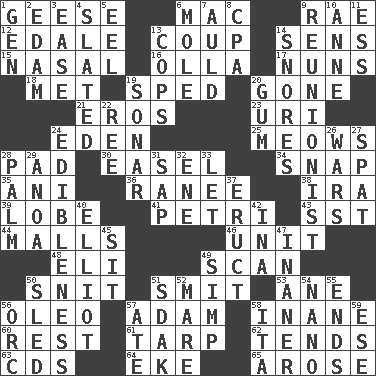 ACROSS 1. Honkers 6. Apple computer (short form) 9. Actress Charlotte 12. Peak District village in England 13. Overturn; upset 14. Elected reps. 15. Relating to the nose 16. Water jar 17. Religious women 18. Was introduced to 19. Drove too fast 20. Went 21. Greek god of love 23. RI univ. 24. Paradise 25. Catcalls? 28. Writing tablet 30. Artist's stand 34. Fastener 35. Black tropical American cuckoo 36. Indian princess (variant) 38. Retirement account (abbr.) 39. Ear part 41. _ dish (used to culture cells) 43. Fast jet (abbr.) 44. Promenades 46. A single undivided whole 48. Connecticut Ivy Leaguer 49. Examine hastily 50. In a ____ (agitated or irritated) 51. Stricken, poetically 53. One (Scot) 56. Butter sub 57. First man 58. Silly 60. Remainder 61. Canvas cover 62. Looks after 63. Music discs 64. Supplement with great effort 65. Came up DOWN 1. Commissioned military rank (abbr.) 2. Dutch treat 3. Comfort 4. Scheduled 5. Snakelike fish 6. Undercover agent 7. Old (Scot.) 8. Tax preparer (abbr.) 9. One who advocates reunion 10. Queen of England 1702-14 11. Double-curved letter 13. 911 reaches them 14. Sounds asleep 19. Underwater navigation system 20. Chewing product 22. To sift 24. The property of being fit to eat 26. Armed conflicts 27. Argument over a trivial matter 28. Inside of hand 29. Small Philippine buffalo 31. Plant excrement 32. Compass dir. 33. Allow 37. Spew [out] 40. American author Paul (1891-1958) 42. _ tizzy (2 wds.) 45. Be seated 47. More empty; more void 49. Simple or foolish person 50. Downhill vehicle 51. Neighbor of Neb. 52. Female horse 54. Billionth: prefix 55. Extremities 56. The grampus (Milton) 57. Had dinner 58. Call ___ day 59. Compass dir.