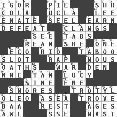 ACROSS 1. Russian composer Stravinsky 5. Sliced dessert 8. Quiet! 11. Root beer relative 12. Southern CA. univ. 14. Area sheltered from the wind 15. Related on the mother's side 17. Sew up the eyelids of hawks and falcons 18. Merit 19. Outscore 21. Rings loudly 23. Perceive with the eye 25. Bar bills 26. 480, 500 or 516 sheets of paper 27. A female animal or person 28. Single 31. Environmental prefix 33. To free from 35. Off limits 37. Narrow, elongated depression 38. Hit sharply and swiftly 40. Good sense 41. Profane or obscene expressions 43. Armed conflict 45. Lair 46. Compass dir. 47. Scottish cap 50. "I Love _" 52. Trig term 53. Compass dir. 54. Sounds asleep 56. Trinitrotoluene 61. Butter sub 62. At sea 65. Collection of objects 66. Sound made by sheep 67. State of inaction 68. Ripens 69. Leather borer 70. Compass dir. 71. Political cartoonist Thomas DOWN 1. On the rocks 2. Went 3. Norwegian king 4. Pace 5. Fluid product of inflammation 6. Frozen water 7. Chooses 8. Volcanic refuse 9. Possessive pronoun 10. Layer 13. Assad's deity 16. Relaxation 18. Followers of ems 20. Lacerate 22. Collude with 24. Independent ruler or chieftain 26. Writer of Portnoy's Complaint (1969) 28. Mitch Miller's instrument 29. Part of speech 30. Greek goddess of the dawn 31. Enthusiasm 32. ____ d'Azur (French Riviera) 34. Obsolete 36. "60 Minutes" Commentator Rooney 37. Male child 39. Diluted with white 42. Use a spoon 44. Undersized animal 48. Approach 49. Makes clutter 51. Certainty 52. "Barney Miller" actor Jack 54. Cole _ (cabbage dish) 55. Anneal 57. Northwest Algerian city 58. Ancient Roman robe 59. Jacques Cousteau's middle name 60. For fear that 61. Chief or king in Benin or Nigeria 63. Curvy letter 64. Had dinner
