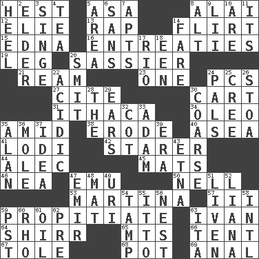 ACROSS 1. Command 5. White ___ sheet 8. Mountain range southwest of Kyrgyzstan 12. Writer Wiesel 13. Reproach for some lapse or misdeed 14. Talk or behave amorously 15. Pulitzer Prize-winning author Ferber 16. Pleas 19. Part of a journey 20. More impudent 21. 480, 500 or 516 sheets of paper 23. Single 24. Personal Computers (abbr.) 27. Quote 30. Draw slowly or heavily 31. New York city 34. Margarine 35. Among 38. Eat (away) 40. At sea 41. Farming town in central California 42. A viewer who gazes fixedly 44. Actor Baldwin 45. Floor coverings 46. Teachers' org. 47. Australian flightless bird 50. 1994 drama film starring Jodie Foster 53. Chrissie's court nemesis 57. One more than two 59. Appease 63. _ the terrible 64. Bake eggs in their shells 65. Mountains (abbr.) 66. Portable shelter 67. Lacquered or enameled metalware 68. Plant holder 69. Of or related to the anus DOWN 1. The bottom of a shoe or boot 2. A person who is older than you are 3. Burn superficially 4. Afternoon social gathering 5. Length times width 6. Without 7. Flats, for short 8. Keyboard modifier key 9. Cards in a Roman deck? 10. "We ___ not amused" (Victoria) 11. ___ a Wonderful Life 14. Conductor's collection 17. River (Sp.) 18. Car or cant ending 20. Stricken, poetically 22. Being or containing an acid 24. Friends 25. Algonquian 26. Portico 28. Definite Article 29. Hearing organs 30. Unrefined 32. Small bed 33. First man 35. Actor Alda or Thicke 36. Undercover agent 37. It may be bright or harebrained 39. Epoch 43. Inactive volcano in Sicily 47. Arab leader 48. Floor protector 49. RI univ. 51. Make or become more lively 52. Woody, climbing, usually tropical plant 54. Pack (down) 55. "Tell ____ the Marines!" 56. A home for chicks 58. International (abbr.) 59. Pacific Standard Time (abbr.) 60. 17th letter of the Greek alphabet 61. Petroleum 62. Before (prefix) 63. Call ___ day