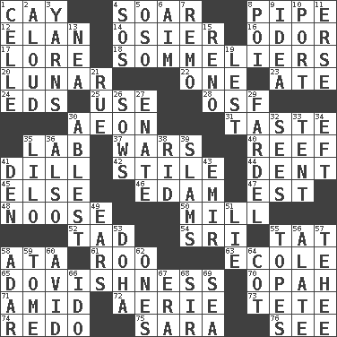 ACROSS 1. Island 4. Fly high 8. Corncob 12. Enthusiasm 14. Flexible twig of a willow tree 16. Scent 17. Old wives' tales, e.g. 18. Wine waiters 20. Type of eclipse 22. Single 23. Had dinner 24. Begley and Asner 25. Purpose 28. Order of Saint Francis (abbr.) 30. Period of immesurable duration 31. Clothes sense 35. Experiment locale 37. Armed conflicts 40. Coral collection 41. Deli pickle 42. Vertical member of a panel or frame 44. Undesirable depression on a surface 45. Otherwise 46. Dutch treat 47. Eastern Standard Time (abbr.) 48. Trap for birds or small mammals 50. Place where flour is made 52. Small boy 54. Indian title of respect (Mr.) 55. Make lace 58. _ moment's notice (2 wds.) 61. Friend of Pooh 63. Learning spot: Fr. 65. Innocence, gentleness, or tenderness 70. Brightly colored fish 71. Among 72. Nest on high 73. False hair 74. Do over again 75. "Two Mules for Sister ____" 76. Perceive with the eye DOWN 1. Cell (Danish) 2. Verbally 3. Tall tales 4. Distress signal 5. Bear (Spanish) 6. Direct toward a target or goal 7. San ____ (Riviera town) 8. Luau course 9. The content of cognition 10. Left side of a ship or aircraft 11. Celtic language 13. Teachers' org. 15. Former U.S. Attorney General Janet 19. For fear that 21. Regret 26. Sty mamas 27. Related on the mother's side 29. Pack 30. Most capable 32. Perceives with the eye 33. Portable shelter 34. Newt 35. _ and Stitch 36. In addition 38. To free from 39. Shuts with force 41. Lair 43. Independent ruler or chieftain 49. Hearing organs 51. Whopper 53. Capital of the state of Qatar 55. Drinks excessively 56. Having winglike extensions 57. Giggle 58. The sixth month of the Jewish calendar 59. Heavy book 60. Enthusiastic 62. Washington bills 64. Small bed 66. Wedding promise 67. Period 68. Title for a knight 69. Ocean