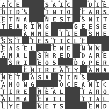 ACROSS 1. Adept person 4. Ketch in the Levant 8. Pass on 11. Auction offers 13. To the inside or interior of 14. Hearing organs 15. Inactive volcano in Sicily 16. Egg locale 17. In a ____ (agitated or irritated) 18. Rending 21. Honkers 22. Queen of England 1702-14 23. Neckwear 25. A female animal or person 26. Fast jet (abbr.) 29. A testis 32. Artist's stand 34. Compass dir. 35. Compass dir. 38. Of or related to the anus 39. Tear up 41. Have the gumption 43. Indian title of respect (Mr.) 44. Greek goddess of the dawn 45. Drug addict 46. Plea 50. Santa ___, CA 51. Fish or hair follower 54. White ___ sheet 55. Airtight sealed metal containers 57. Amid 59. Pertaining to the sea 63. Hoop that covers a wheel 64. Actress Patricia 67. Edible starchy tuberous root 68. _ mater 69. Tending to cause great harm 70. Slanted text style (abbr.) 71. Sodium hydroxide 72. Soaks 73. Conclude DOWN 1. Collude with 2. Quote 3. Pulitzer Prize-winning author Ferber 4. Scorches 5. A saturated hydrocarbon 6. It is 7. Small bed 8. Natives or inhabitants of Denmark 9. From or relating to Ireland 10. First name in cosmetics 12. "Two Mules for Sister ____" 14. Compass dir. 19. International (abbr.) 20. Compass dir. 21. Set 23. Prong on a fork 24. On the rocks 26. Ocean 27. Without 28. Russian ruler of old 30. Laconic 31. Inside; within (prefix) 33. Writer Wiesel 36. California wine valley 37. Songbird 39. Puts into a specified state 40. Israeli folk dance 42. Epoch 45. Unit of force 47. Tired old horse 48. Ringlike coral islands and reefs 49. Nervous spasm 51. Brizilian seaport 52. Poet Dickinson 53. Singer Mel 56. Suttee (variant) 58. Teachers' org. 60. Nathan's nickname 61. SW Asia republic 62. Chilled 64. ___ Haven, CT 65. First lady 66. Small island