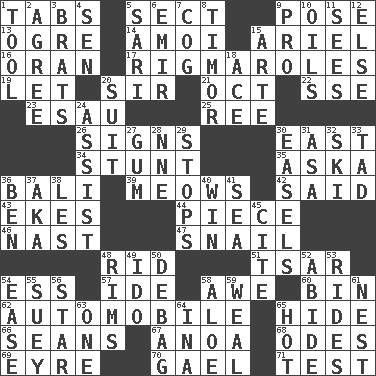 ACROSS 1. Bar bills 5. Religious group 9. Airs 13. Legendary monster 14. Mine, in Marseilles 15. Satellite of Uranus 16. Northwest Algerian city 17. Complicated, petty procedures 19. Allow 20. Title for a knight 21. Sep. follower 22. Compass dir. 23. Son of Isaac 25. To separate or throw off 26. Omens 30. 90 degrees 34. Check the growth or development of 35. "____ silly question..." 36. Indonesian resort city 39. Catcalls? 42. Expressed in words 43. Makes supply last 44. Component 46. Political cartoonist Thomas 47. Slow-paced one 48. To free from 51. Russian ruler of old 54. Double-curved letter 57. Binary compound 58. Deep reverence 60. Storage container 62. Form of transportation 65. Flintstone garb 66. Seines 67. Small Philippine buffalo 68. Lyric poems 69. Jane of fiction 70. Highlander 71. Trial DOWN 1. Instrument 2. Match 3. Naughty children 4. Elected rep. 5. Indian skirt 6. Arab leader 7. Gear tooth 8. The easternmost of the Lesser Sundas 9. Adept person 10. Petroleums 11. Perceives with the eye 12. Otherwise 15. Johnson of "Laugh-In" 18. Adept person 20. Set of matching outer garments 24. Help 27. Chewing product 28. Compass dir. 29. Obstructs or blocks passage 30. Artist's stands 31. White ___ sheet 32. What Jean-Claude Killy likes to do 33. Bit 36. Benjamin's nick name 37. Alias (abbr.) 38. French article 40. Acquire through effort 41. Ocean 45. Quote 48. Basketball hoops 49. Wedding promise 50. Debunk (Brit. slang) 52. Remain 53. Amusement-park features 54. Relaxation 55. Chop _ 56. Play the lead 58. Medicinal plant 59. Welt 61. A home for chicks 63. Single 64. _ tizzy (2 wds.) 65. Being at a high temperature