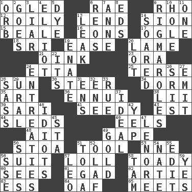 ACROSS 1. Stared at amorously 6. Actress Charlotte 9. 17th letter of the Greek alphabet 12. Turbulent 13. Grant temporary use of 14. The Jewish people; Israel 15. Calif. Air Force Base 16. Immeasurably long periods of time 17. Stare 18. _ Lanka 19. Relaxation 20. Unable to walk 21. Pig sound 23. Mouth or opening 24. Singer James 25. Laconic 28. Player for Phoenix 30. Bull 34. Dormintory (informal) 35. Tate display 36. World-weariness 38. Cards in a Roman deck? 39. Indian skirt 41. Shabby and untidy 43. Eastern Standard Time (abbr.) 44. Bobsleighs 46. Snakelike fish 48. Small island 49. Open wide 50. Portico 51. Instrument 53. Compass dir. 56. Set of matching outer garments 57. Hang loosely or laxly 58. Sycophant 60. Observes 61. Mild oath 62. Nick name for Arthur 63. Curvy letter 64. Clumsy lout 65. Confronts DOWN 1. Globe 2. Leaves 3. One who doesn't tell the truth 4. American author Paul (1891-1958) 5. Color 6. Vintage cars 7. Queen of England 1702-14 8. Begley and Asner 9. Frustrating wastes of time 10. Hollow 11. Single 13. Path through which fluid escapes 14. Flew 19. Maternal 20. Car dealer's back yard 22. ___ a Wonderful Life 24. Pleas 26. Indian titles of respect 27. Give off 28. Backtalk 29. Mountain range 31. Followers of ems 32. Compass dir. 33. Sorrow 37. Standard of perfection 40. Foolish or stupid persons 42. Slangy assent 45. R.R. building 47. Poe poem 49. Precious metal 50. Institutes legal proceedings 51. Ancient Roman robe 52. Norwegian king 54. Nathan's nickname 55. Prepare for publication 56. Compass dir. 57. Lion 58. Scottish cap 59. Affirmative reply