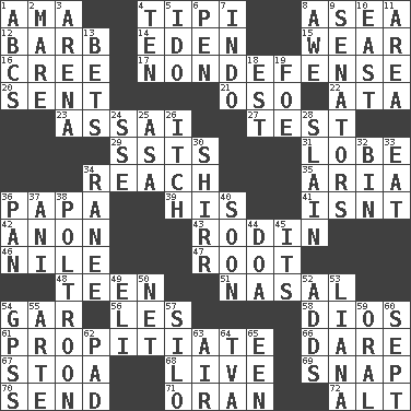 ACROSS 1. Nursemaid (var.) 4. Native american tent (variation) 8. Toward the sea 12. Sharp remark 14. Paradise 15. Put on (as clothing) 16. Algonquian 17. Unrelated to defense, as in spending 20. Emitted 21. Bear (Spanish) 22. _ moment's notice (2 wds.) 23. Slender Brazilian palm 27. Trial 29. Fast planes 31. Ear part 34. Arrive at 35. Operatic vocal solo 36. Dad 39. Part of HMS, perhaps 41. Is not 42. Soon (poet.) 43. "The Thinker" sculptor 46. Mediterranean tributary 47. Carrot, for example 48. Adolescent 51. Rhinal 54. Slender fish 56. French article 58. "Vaya con ____" 61. Conciliate 66. Have the gumption 67. Portico 68. Moving, as bait 69. Fastener 70. Post 71. NW Algerian seaport 72. The first octave above the treble staff DOWN 1. Lettered men learn these first 2. Female horse 3. Sports stadium 4. Nine, plus one 5. Wedding promise 6. Writing instrument 7. _ china 8. Deep reverence 9. Legislators 10. 90 degrees 11. Type of rug 13. Stakes 18. Eastern Standard Time (abbr.) 19. Enemy 24. Compass dir. 25. White ___ sheet 26. Hankering 28. Killed 30. Bake eggs in their shells 32. Storage container 33. Ingest 34. The wife of a rajah (variant) 36. Baking dish 37. Black tropical American cuckoo 38. Coward 40. Within a short period 44. ___ good deed 45. ___ a Wonderful Life 49. Connecticut Ivy Leaguer 50. Remaining after all deductions 52. Sums up 53. Climbing, woody, usually tropical vines 54. Global Positioning Systems (abbr.) 55. Johnson of "Laugh-In" 57. Grain storage tower 59. Relating to the mouth 60. Back-to-school mo. 62. Writing tablet 63. Atmosphere 64. Federal power corp. 65. Car or cant ending