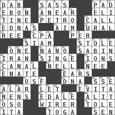 ACROSS 1. Pat or tap gently 4. Backtalk 8. Writing tablet 11. Inky black, to poets 13. Approach 15. Biblical high priest 16. Prong on a fork 17. Stone: prefix 18. Give a ring to 19. Ferber et al. 21. Direct toward a target or goal 22. Mountain range 23. Portuguese money of account (variant) 24. Accounting whiz (abbr.) 27. For each 29. Thailand, formerly 30. Took without asking 34. Single 36. Billionth: prefix 39. Unit of acoustic absorption 40. SW Asia republic 41. Burn superficially 43. Charged atoms 44. Lessep's creation 46. 1994 drama film starring Jodie Foster 47. Born 48. Related on the mother's side 49. Hearing organs 51. Order of Saint Francis (abbr.) 53. Heredity factor (abbr.) 54. Compass dir. 57. Having or resembling wings 60. Allow 63. Webber/Rice musical 65. Not women's 66. Peak District village in England 69. Came down and settled, as after flight 70. Bear (Spanish) 71. One who wires 72. Lacquered or enameled metalware 73. Call ___ day 74. Ancient Roman robe 75. Elected rep. DOWN 1. Prevent from occurring 2. Stay 3. Child's nurse 4. Plant excrement 5. One (Scot) 6. Stalk of a moss capsule 7. Indian skirt 8. Lightbulb-shaped fruit 9. Silent film actress Nazimova 10. Deli pickle 12. Teachers' org. 14. Frolic 18. Window treatments 20. _-fi 25. Baking dishes 26. With great haste 28. Double-curved letter 29. Legislators 31. Mitch Miller's instrument 32. Actor's bit 33. Followers of ems 34. NW Algerian seaport 35. Nanny 37. Compass dir. 38. Stared 40. Frozen water 42. Flair 45. French article 50. Actress Charlotte 52. Soared 54. Grain storage towers 55. Vertical member of a panel or frame 56. Consumed 57. Mine, in Marseilles 58. For fear that 59. Small Philippine buffalo 61. Prepare for publication 62. Edible starchy tuberous root 64. Large container 67. Part of a journey 68. Epoch