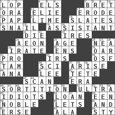 ACROSS 1. Trim (branches) 4. Raised railways 7. Cy Young winner Saberhagen 11. Mouth or opening 12. Writer Wiesel 13. Wear away 14. Infant food 15. Citrus frut 16. Chalkboards 17. Slow-paced one 19. Helper 21. Pass on 23. Angers 24. Period of immesurable duration 25. Mature 26. Teachers' org. 29. Feeling or showing extreme anger 30. Followers of ems 31. Rowing implement 32. Adept person 33. Big collection agency 34. Order of Saint Francis (abbr.) 35. Scottish cap 36. _-fi 37. Get up 40. Santa ___, CA 41. Area sheltered from the wind 42. False hair 43. Glance over 45. Period 46. Making a chance decision by using lots 51. Extreme 55. Foolish or stupid persons 56. Grant temporary use of 58. Car or cant ending 59. Having high moral qualities 60. Allows 61. Added to 62. Celtic language 63. Chicken ___ king 64. Filthy place DOWN 1. Chops off 2. NW Algerian seaport 3. Dad 4. Biblical high priest 5. Pale green bean 6. Observes 7. Naughty children 8. Roll call or roster of names 9. Paradise 10. Trial 12. American author Paul (1891-1958) 13. Otherwise 16. Founders of families 18. The content of cognition 20. Omens 22. Compass dir. 24. Odor 25. Nest on high 26. Trap for birds or small mammals 27. Comfort 28. Sandy's bark 29. SW Asia republic 32. Parent Teacher Association (abbr.) 33. Ancient Celtic tribe of eastern Britain 36. Narrow boards 37. Had dinner 38. Summer TV shows 39. Slanted text style (abbr.) 43. Took without asking 44. Quote 46. Trig term 47. Aroma 48. Chest bones 49. Spanish pot 50. Christmas carol 52. Beverages made from leaves 53. Monthly bill 54. Actor Griffith 57. "One Day ___ Time"