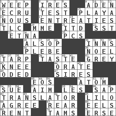 ACROSS 1. Shed a tear 5. Angers 9. Arabian gulf 13. Shade of tan 14. Trial 15. Beach, in Buenos Aires 16. Good sense 17. Pleas 19. Affectionate concern, for short 20. Madame (abbr.) 21. It would 22. Fast jet (abbr.) 23. Inactive volcano in Sicily 25. Personal Computers (abbr.) 26. Columnist Joseph or Stewart 30. Lodging establishments 34. Cadet 35. Christmas carol 36. Canvas cover 39. Clothes sense 42. Jennifer or Joel 43. Leg joint 44. Speak pompously 46. Wrote a lyric poem 47. Founders of families 48. Greek goddess of the dawn 51. Tiny particle 54. Institute legal proceedings 57. Direct toward a target or goal 58. French article 60. Plant excrement 62. Interpreter 65. _ and Stitch 66. Match 67. Located in or toward the back 68. Snakelike fish 69. Monthly bill 70. Scottish caps 71. Celtic language DOWN 1. Gone 2. Learning spot: Fr. 3. Spew [out] 4. Fluid product of inflammation 5. Detail 6. French philosopher Descartes 7. Eastern Standard Time (abbr.) 8. Empty completely 9. The first octave above the treble staff 10. Raised platform 11. Snake ____ (dice throw) 12. Political cartoonist Thomas 15. Groovy apts. 18. And so on (abbr.) 20. Promenade 24. Slept 27. Arrange properly for use 28. Chief or king in Benin or Nigeria 29. Mexican monetary units 30. Consume 31. Not either 32. Born 33. Roguish 36. Ring climax 37. Added to 38. To riddle 40. Three (prefix) 41. Hearing organ 45. Beverages made from leaves 48. Relaxation 49. Petroleum 50. Don Adams' spy role 52. Flexible twig of a willow tree 53. Promenades 54. Play the lead 55. Goad 56. Merit 58. Rich soil 59. Blunders 61. Airs 63. Fish or hair follower 64. Beverage made from leaves 65. Area sheltered from the wind