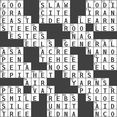 ACROSS 1. Thick or sticky substance 4. Cole _ (cabbage dish) 8. Farming town in central California 12. Mouth or opening 13. Quote 14. SW Asia republic 15. Compass direction 17. The content of cognition 18. Acquire or gain knowledge or skills 19. Navigate 21. Friend of Pooh 23. French article 24. _____ Park, CO 26. Tired old horse 28. Snakelike fish 30. Commissioned military rank 34. White ___ sheet 37. 43,560 square feet 39. Billionth: prefix 40. Fenced enclosure 41. Giggle 43. Bar bill 44. Stalk of a moss capsule 46. Olfactory organ 47. Raised railways 48. Curse 51. Blunders 54. Atmosphere 55. Tall tales 58. For each 61. Large container 63. Peter (Polish) 65. Grin 67. Confederate soldiers (slang) 71. _ gin 72. Drop; flow; fall 73. A single undivided whole 74. Assist 75. Family _ (genealogy) 76. Pulitzer Prize-winning author Ferber 77. Non-commissioned officer (abbr.) DOWN 1. Travels 2. Declaim 3. Fertile tracts in a desert 4. _-fi 5. Hat (slang) 6. Had dinner 7. Erode 8. Falsehood 9. Spoken 10. Have the gumption 11. Restaurants 16. False hair 18. Grant temporary use of 20. Portuguese money of account (variant) 22. Single 25. Narrow board 27. Commissioned mil. rank 29. Aroma 30. Honkers 31. Pace 32. Of or related to the anus 33. Tennis shots 34. Domed church section 35. Ooze 36. Against 38. 17th letter of the Greek alphabet 42. Suggestive of the supernatural 45. _ moment's notice (2 wds.) 49. Hub of activity 50. Period 52. Reproach for some lapse or misdeed 53. Indian titles of respect 56. Pitcher Ryan 57. Unemotional 58. Inconspicuous attention getter 59. Arab leader 60. Cause heat under the collar 62. Loyal 64. Make new 66. Area sheltered from the wind 68. Conclusion 69. Storage container 70. R.R. building