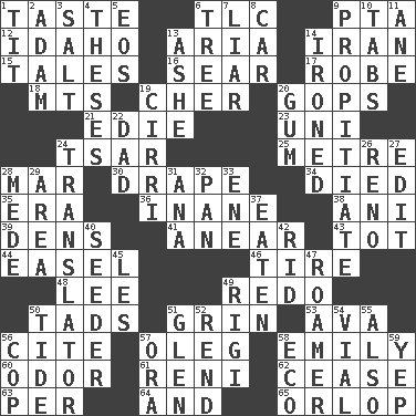 ACROSS 1. Clothes sense 6. Affectionate concern, for short 9. Parent Teacher Association (abbr.) 12. Potato state 13. Operatic vocal solo 14. SW Asia republic 15. Falsehoods 16. Dry up 17. Loose flowing garment 18. Mountains (abbr.) 19. "Mermaids" star 20. Republicans 21. Singer Brickell 23. University (slang) 24. Russian ruler of old 25. Distance measurement (Brit.) 28. Spoil 30. Window treatment 34. Passed on 35. Period 36. Empty; void 38. Cuckoo 39. Habitations of wild animals 41. Approach 43. Small child 44. Artist's stand 46. Become fatigued 48. Area sheltered from the wind 49. Redecorate 50. Small amounts or degrees 51. Broad smile 53. Actress Gardner 56. Quote 57. Cassini of fashion 58. Poet Dickinson 60. Scent 61. Painter Guido (1575-1642) 62. Desist 63. For each 64. Added to 65. Fourth or lowest deck DOWN 1. Teat (slang) 2. First of billions? 3. Table seasoning 4. College papers 5. Greek goddess of the dawn 6. Family _ (genealogy) 7. One who doesn't tell the truth 8. 4-wheeled motor vehicle 9. Conciliate 10. Bar bills 11. A saturated hydrocarbon 13. American tennis player Robert 14. Pressed 19. High-altitude cloud 20. Chewing product 22. June honoree 24. Interpreter 26. Former U.S. Attorney General Janet 27. Prepare for publication 28. Ancient Persian 29. Length times width 31. Santa ___, CA 32. Baking dish 33. Compass dir. 37. Ingested 40. Sowing specialist 42. To free from 45. French article 47. Wanderer 49. Swiss mountan, "Queen of the Mountains" 50. Periodic rise and fall of the sea level 51. Small, secluded valley 52. Tear apart 54. Small bottle 55. In addition 56. Police officer (slang) 57. Mouth or opening 58. Environmental prefix 59. Slangy assent