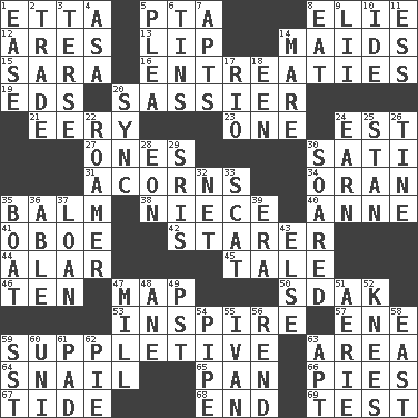 ACROSS 1. Singer James 5. Parent Teacher Association (abbr.) 8. Writer Wiesel 12. Ancient Greek god of war 13. Mouth edge 14. Women servants 15. "Two Mules for Sister ____" 16. Pleas 19. Begley and Asner 20. More lively and spirited 21. Suggestive of the supernatural 23. Single 24. Eastern Standard Time (abbr.) 27. Singles 30. Suttee (variant) 31. Oak nuts 34. NW Algerian seaport 35. Lip ointment 38. Sibling's daughter 40. Queen of England 1702-14 41. Mitch Miller's instrument 42. A viewer who gazes fixedly 44. Having or resembling wings 45. Story 46. Nine, plus one 47. Atlas unit 50. Neighbor of Neb. 53. Stimulate to action 57. Compass dir. 59. Supplementary 63. Type of rug 64. Slow-paced one 65. Baking dish 66. Sliced desserts 67. Periodic rise and fall of the sea level 68. Conclusion 69. Trial DOWN 1. Comfort 2. Barter 3. Laconic 4. White ___ sheet 5. Entreaty 6. Airtight sealed metal containers 7. Flats, for short 8. Erode 9. Cards in a Roman deck? 10. Binary compound 11. Double-curved letter 14. Female horse 17. _ de Janeiro 18. Car or cant ending 20. Synchronize (abbr.) 22. Wanderer 24. Merit 25. Comedian Laurel of Laurel & Hardy 26. Prong on a fork 28. Period of immesurable duration 29. Indian titles of respect 30. Flew 32. Remaining after all deductions 33. Get outta here! 35. Water vessel 36. Competent 37. Grant temporary use of 39. Epoch 43. Otherwise 47. Place where flour is made 48. A saturated hydrocarbon 49. Pacific Standard Time (abbr.) 51. Nest on high 52. Leg joints 54. Corncob 55. "Terrible" tsar 56. Tear apart 58. Compass direction 59. Fast jet (abbr.) 60. Single; one (prefix) 61. Groovy apt. 62. Sliced dessert 63. Fitting