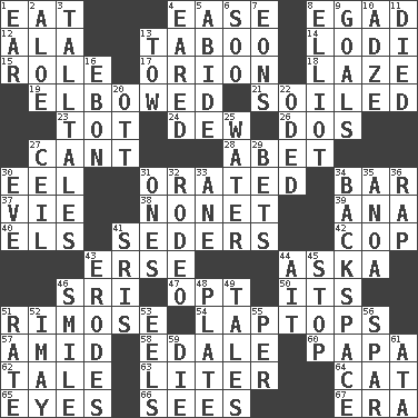 ACROSS 1. Ingest 4. Relaxation 8. Mild oath 12. Insect wing 13. Off limits 14. Farming town in central California 15. Hero or heavy, e.g. 17. Greek mythologigal hunter 18. Goldbrick 19. Shoved, as through a crowd 21. Dirtied 23. Small child 24. Morning condensation 26. Two (Sp.) 27. Patter 28. Collude with 30. Snakelike fish 31. Spoke pompously 34. Tavern 37. Compete 38. Music written for nine 39. Santa ___, CA 40. Raised railways 41. Spring feasts 42. Police officer (slang) 43. Celtic language 44. "____ silly question..." 46. _ Lanka 47. Elect 50. It is 51. Full of chinks, cracks, or crevices 54. Portable computers 57. Among 58. Peak District village in England 60. Dad 62. Falsehood 63. 61 cubic inches 64. Feline 65. Sight organs 66. Perceives with the eye 67. Period DOWN 1. Ewer handle 2. Medicinal plant 3. Baron Munchausen's specialties 4. Having ears or earlike features 5. Remain 6. "Barney Miller" actor Jack 7. Immeasurably long periods of time 8. American author Paul (1891-1958) 9. Finish lines 10. Axlike tool, used for shaping wood 11. Passed on 13. Pull behind 16. Inky black, to poets 20. Baseball player Mel 22. Wrote a lyric poem 25. Wetness 27. To provide with a ceiling 29. Wagers 30. First lady 31. Singles 32. Cowboy competition 33. A saturated hydrocarbon 34. Keyboard key 35. Small Philippine buffalo 36. Strike 41. Indian titles of respect 43. Eats (away) 44. Small island 45. Obstruct or block passage 46. Grin 48. Food holder 49. Falsehoods 51. Assign a rank or rating to 52. "If ____ say so..." 53. Snakelike fish 55. For each 56. Coast Guard woman 59. Expire 61. "One Day ___ Time"