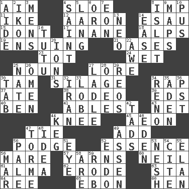 ACROSS 1. Direct toward a target or goal 4. A type of plum 8. Naughty child 11. Mamie's mate 12. Composer Copland 14. He sold his birthright 15. Do not 17. Empty; void 18. High mountains 19. Following as a consequence or result 21. Fertile tracts in a desert 23. Small child 24. Dripping 25. Part of speech 27. Old wives' tales, e.g. 30. Scottish cap 31. Fodder prepared in a silo 34. Reproach for some lapse or misdeed 37. Had dinner 38. Cowboy competition 39. Begley and Asner 40. Benjamin's nick name 41. Most capable 43. Remaining after all deductions 44. Leg joint 45. Period of immesurable duration 47. Make a knot 49. Find the sum of 50. Plash 52. Center 56. Female horse 57. Entertaining tales 60. Famous astronaut Armstrong 61. _ mater 62. Eat (away) 63. R.R. building 64. To separate or throw off 65. Inky black, to poets 66. Layer DOWN 1. Assistant 2. Image 3. Not women's 4. Virtuous person 5. Austrian-born American filmmaker Fritz 6. Mouth or opening 7. Period of immesurable duration 8. Small island 9. Atlas contents 10. Product of festering 13. Modern: prefix 14. Comfort 16. Ballerina skirt 20. Charged particles 22. Deep reverence 25. Nathan's nickname 26. Sign of something about to happen 27. Dipping utensil 28. Double curve, resembling the letter S 29. Vintage cars 30. Keyboard key 32. SW Asia republic 33. Ear part 34. Western Nevada city 35. An important port of Yemen 36. Pacific Standard Time (abbr.) 42. Bits 44. Barrel 46. Locale of original sin 47. Singer Mel 48. The main thing one is thinking about 49. NE Netherlands city 50. Light colored 51. Sight organ 52. Inside; within (prefix) 53. Delicate 54. Quote 55. Flair 56. Spoil 58. "We ___ not amused" (Victoria) 59. Director Reiner