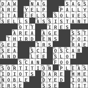 ACROSS 1. Obsolete 4. Tired old horse 7. Sinks 11. "We ___ not amused" (Victoria) 12. Sharp bark 13. Chummy 14. Call ___ day 15. Snakelike fish 16. Finds the solution 17. Exchanges for money 19. Helper 21. Baseball player Mel 23. Angers 24. Length times width 25. Grow older 26. Fast jet (abbr.) 29. One of three equal parts 30. Followers of ems 31. Luau course 32. Unit of force equal to gravity 33. Big collection agency 34. Actress Charlotte 35. Ocean 36. _-fi 37. Witty Wilde 40. Also 41. Area sheltered from the wind 42. Slit 43. Examine minutely or intensely 45. Egg _ yung 46. Decision 51. Entreaties 55. Foolish or stupid persons 56. Have the gumption 58. Madame (abbr.) 59. Having high moral qualities 60. Colored 61. Electrically charged atom 62. Celtic language 63. Compass dir. 64. Teat (slang) DOWN 1. Raised platform 2. Johnson of "Laugh-In" 3. Welt 4. Born 5. Silent film actress Nazimova 6. Global Positioning Systems (abbr.) 7. Table seasonings 8. Inventor's middle name 9. Small, secluded valley 10. System (abbr.) 12. Of or pertaining to yesterday 13. Airs 16. Begets 18. Australian parrot (variant) 20. Signals 22. Small boy 24. Having the leading position 25. Nest on high 26. Small fatty European fish 27. Fly high 28. Make a knot 29. Adolescent 32. Girls' org. (abbr.) 33. Ancient Celtic tribe of eastern Britain 36. Narrow boards 37. Order of Saint Francis (abbr.) 38. Slanted 39. Calm and collected 43. Fur scarf 44. Quote 46. Trig term 47. Aroma 48. Chest bones 49. Likelihood 50. Negative votes 52. Give off 53. Mine, in Marseilles 54. Posted 57. To riddle