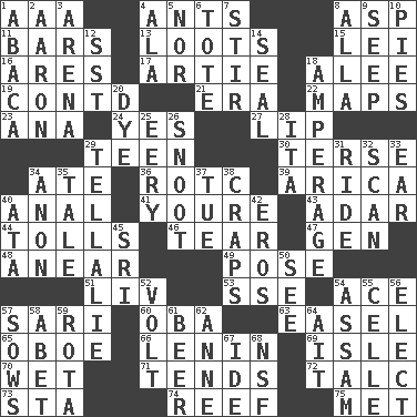 ACROSS 1. American Automobile Association (abbr.) 4. Pismires 8. Cleo's killer 11. Oblong pieces of solid material 13. Plunders 15. Flowery wreath 16. Ancient Greek god of war 17. Nick name for Arthur 18. Toward shelter 19. Continued (abbr.) 21. Period 22. Atlas contents 23. Santa ___, CA 24. Affirmative reply 27. Mouth edge 29. Adolescent 30. Laconic 34. Had dinner 36. College mil. group 39. N. Chile seaport 40. Of or related to the anus 41. You are 43. The sixth month of the Jewish calendar 44. For Whom the Bell _____ 46. Rend 47. Commissioned mil. rank 48. Approach 49. Airs 51. 54 in ancient Rome 53. Compass dir. 54. Adept person 57. Indian skirt 60. Chief or king in Benin or Nigeria 63. Artist's stand 65. Mitch Miller's instrument 66. Soviet premier 1918-24 69. Small island 70. Soggy 71. Watches over 72. Baby powder 73. R.R. building 74. Coral ridge 75. Was introduced to DOWN 1. Phillipine bananalike plant 2. Composer Copland 3. Sports stadium 4. Chicken ___ king 5. And not 6. Lug 7. Disorderly outburst 8. Silent film actress Nazimova 9. Ooze 10. Sliced desserts 12. Fast jet (abbr.) 14. Lick closed 18. Electrical Measurement 20. Color 25. Suggestive of the supernatural 26. Snout, nose 28. Call ___ day 29. Copy Pinocchio 31. Travel on or in a vehicle 32. Examine minutely or intensely 33. Hearing organ 34. At once, immediately (arch.) 35. Story 37. Third day of the wk. 38. Dice game 40. _ moment's notice (2 wds.) 42. Greek god of love 45. Indian title of respect (Mr.) 50. Perceive with the eye 52. Electrical Unit 54. Indian state 55. Cell (Danish) 56. Voters do this 57. Sty mamas 58. Collude with 59. Roll call or roster of names 61. Fermented drink made from hops 62. Singer Murray 64. Small island 67. Binary compound 68. Overdraft (abbr.)