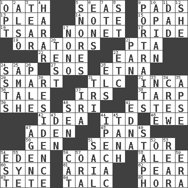 ACROSS 1. Pledge 5. Oceans 9. Groovy apts. 13. Entreaty 14. Brief written record 15. Brightly colored fish 16. Russian ruler of old 17. Music written for nine 18. Travel on an animal 19. Speakers 21. Parent Teacher Association (abbr.) 22. French philosopher Descartes 23. Merit 24. Plant excrement 27. Mayday 28. Inactive volcano in Sicily 29. Don Adams' spy role 31. Affectionate concern, for short 32. South American Indian 36. Story 37. Big collection agency 38. Canvas cover 39. "______ My Girl" (Turtles hit) 40. _ Lanka 41. _____ Park, CO 42. The content of cognition 44. It would 46. She-sheep 47. An important port of Yemen 48. Baking dishes 50. Commissioned military rank (abbr.) 51. Elected representative 54. Paradise 56. Team commander 58. Toward shelter 60. Synchronize (abbr.) 61. Operatic vocal solo 62. Lightbulb-shaped fruit 63. Wig 64. Baby powder 65. Israeli folk dance DOWN 1. Choose 2. In addition 3. Separate forcefully 4. Ethiopian city, capital of Harari 5. Sounds asleep 6. Immeasurably long periods of time 7. Had dinner 8. Put into a specified state 9. Likenesses of persons 10. Bee-related 11. June honoree 12. A female animal or person 17. Words to Nanette 20. Trial 21. Baking dish 23. And so on (abbr.) 24. Fast planes 25. Nursemaid 26. Diluted with white 28. Raised railways 30. Dwelling 31. Three (prefix) 33. Nathan's nickname 34. Ship's personnel 35. Domed church section 37. Lyricist Gershwin 40. Elected rep. 41. Pulitzer Prize-winning author Ferber 43. Lair 44. Medicinal drug used to evoke vomiting 45. Hyperbolic tangent 47. Rep 49. Staphylococcus 51. Travel by water 52. Butter sub 53. Tail end 54. Eastern Standard Time (abbr.) 55. Color 56. Feline 57. Mouth or opening 59. Epoch