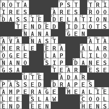 ACROSS 1. Roll call or roster of names 5. Pacific Standard Time (abbr.) 8. Three (prefix) 11. Angers 12. Ancient Greek god of war 13. Friend of Pooh 14. Small ungulate mammals of Africa 17. Accusation by an informer 19. Watched over 21. Foolish or stupid persons 22. Nanny 23. Commissioned military rank (abbr.) 24. Actress Gardner 27. Political cartoonist Thomas 29. _ moment's notice (2 wds.) 32. Haggard of country music 34. Epoch 36. Having or resembling wings 37. Double curve, resembling the letter S 38. Pet locale 39. _ and Stitch 40. Billionth: prefix 41. Small drink 42. Natives or inhabitants of Denmark 43. Girls' org. (abbr.) 44. Separate forcefully 46. Compass dir. 47. Shoshoni 50. The sixth month of the Jewish calendar 52. Went by 55. Window treatments 57. Electrical Measurement 59. Ear of corn 62. Area sheltered from the wind 63. Cole _ (cabbage dish) 64. Calm and collected 65. Conclude 66. Car or cant ending 67. Coop moms DOWN 1. To free from 2. Mouth or opening 3. Trial 4. NE Netherlands city 5. Before (prefix) 6. Former Milwaukee Brewers owner Bud 7. Sadhe (variant) 8. Musical group of three 9. Carrot, for example 10. Charged particles 12. Find the sum of 15. Silly 16. Pulitzer Prize-winning author Ferber 18. Shallow baking pan 20. Artist's stands 24. Amid 25. Viva Las _ 26. Sports stadium 28. Distinguishing feature 29. Place in a line 30. Lies 31. Came up 33. Lion 35. Seem 36. In the manner of 42. Window treatment 45. First of billions? 47. Purpose 48. Laconic 49. Peak District village in England 51. Arrive at 52. Light colored 53. So be it 54. Drove too fast 55. Morning condensation 56. _ gin 58. Separate the seeds from cotton 60. Electrically charged atom 61. Raised railways