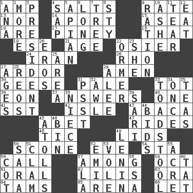 ACROSS 1. Electrical Unit 4. Table seasonings 9. Assign a rank or rating to 13. And not 14. To the left, to Queeg 15. Toward the sea 16. "We ___ not amused" (Victoria) 17. Abounding in pines 18. Not this but _ 19. Compass dir. 21. Personal question 22. Flexible twig of a willow tree 24. SW Asia republic 26. 17th letter of the Greek alphabet 27. Zeal 29. So be it 30. Honkers 31. Light colored 33. Small child 36. Period of immesurable duration 37. Replies 40. Single 41. Fast jet (abbr.) 42. Small island 43. Phillipine bananalike plant 45. Collude with 47. Amusement-park features 48. Nervous spasm 49. Flaplike coverings 50. Biscuitlike quick bread 52. Night before a holiday 54. R.R. building 56. Give a ring to 57. Amid 59. Sep. follower 61. Spoken 62. Ms. Damita and namesakes 63. Mouth or opening 64. Scottish caps 65. Sports stadium 66. Allow DOWN 1. Santa ___, CA 2. Greater amount 3. Elected leader of a country 4. Plant excrement 5. Bee-related 6. Yearn 7. Family _ (genealogy) 8. Filthy place 9. Food allowance for one day 10. American tennis player Robert 11. Lacerate 12. Consume 20. Greek god of love 22. Channel Islands abalone 23. A female animal or person 25. Type of rug 27. Eons 28. Vintage cars 29. Toward shelter 31. Inconspicuous attention getter 32. Leather borer 33. Inedible or poisonous agaric 34. Single time 35. Beverages made from leaves 38. Sibling's daughter 39. Indian skirt 44. Auction offers 45. Ringlike coral islands and reefs 46. Storage container 49. Soviet premier 1918-24 50. "Two Mules for Sister ____" 51. Dollar (slang) 52. Independent ruler or chieftain 53. Grand slam 55. 43,560 square feet 56. Small bed 57. Insect wing 58. Girls' org. (abbr.) 60. Make lace