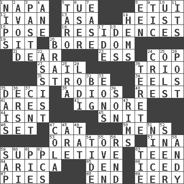 ACROSS 1. California wine valley 5. Third day of the wk. 8. Needle case 12. "Terrible" tsar 13. White ___ sheet 14. Robbery 15. Airs 16. Homes 19. Be seated 20. Mood resulting from idleness 21. Letter starter 23. Curvy letter 24. Police officer (slang) 27. Move on water 30. Musical group of three 31. Disco prop 34. Snakelike fish 35. Tenth: prefix 38. Goodbye (Sp.) 40. Remainder 41. Ancient Greek god of war 42. Snub 44. Is not 45. In a ____ (agitated or irritated) 46. Put into a specified state 47. Domesticated feline 50. Not women's 53. Speakers 57. _ tizzy (2 wds.) 59. Supplying deficiencies 63. Adolescent 64. N. Chile seaport 65. Lair 66. On the rocks 67. Sliced desserts 68. Conclusion 69. Suggestive of the supernatural DOWN 1. Cuts off 2. Prevent from happening 3. Thick mixture 4. One (Scot) 5. Edible starchy tuberous root 6. One who makes use of a thing 7. Relaxation 8. Car or cant ending 9. Nervous spasm 10. Purpose 11. It is 14. Cloth borders 17. Binary compound 18. Two (Sp.) 20. Naughty child 22. Help 24. Algonquian 25. Petroleums 26. Mail 28. Lyricist Gershwin 29. Farming town in central California 30. Cigar-shaped 32. Massive 33. Immeasurably long periods of time 35. Raised platform 36. Celtic language 37. Penny 39. Boy, to dad 43. Basketball hoops 47. Root beer relative 48. "We ___ not amused" (Victoria) 49. Make lace 51. Sibling's daughter 52. Contemptuous expression 54. Periodic rise and fall of the sea level 55. Baking chamber 56. Tear apart 58. "60 Minutes" Commentator Rooney 59. Plant excrement 60. RI univ. 61. Sliced dessert 62. Personal Computers (abbr.) 63. Standoff