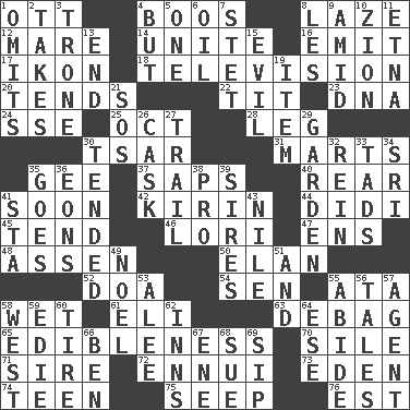 ACROSS 1. Baseball player Mel 4. Scornful sounds 8. Goldbrick 12. Female horse 14. Join together 16. Send forth 17. Image 18. Boob tube 20. Is inclined (to) 22. Teat (slang) 23. Heredity factor (abbr.) 24. Compass dir. 25. Sep. follower 28. Part of a journey 30. Russian ruler of old 31. Shops 35. Unit of force equal to gravity 37. Plant excrements 40. Posterior 41. Within a short period 42. Japanese brewing company 44. "You Light Up My Life" star Conn 45. Be inclined (to) 46. Australian parrot (variant) 47. Followers of ems 48. NE Netherlands city 50. Enthusiasm 52. ___ good deed 54. Elected rep. 55. _ moment's notice (2 wds.) 58. Dripping 61. Connecticut Ivy Leaguer 63. Debunk (Brit. slang) 65. The property of being fit to eat 70. Drop; flow; fall 71. Title for a man of rank and authority 72. World-weariness 73. Locale of original sin 74. Adolescent 75. Ooze 76. Eastern Standard Time (abbr.) DOWN 1. Leaves out 2. Proceeds 3. Marketplace scale 4. With the exception that 5. Single 6. Lubricate 7. Proofreading order 8. French article 9. Among 10. The Jewish people; Israel 11. Inactive volcano in Sicily 13. Conclude 15. Morally bad or wrong 19. A whole individual unit 21. Distress signal 26. Keg 27. Go after with the intent to catch 29. Place where plants grow 30. Watched over 32. It's straight from the horse's mouth 33. Small amounts or degrees 34. _ Lanka 35. Moves 36. Immeasurably long periods of time 38. Adept person 39. Male parents of animals 41. R.R. building 43. The longest river in the world 49. Christmas carol 51. Also 53. Toward shelter 55. Stay 56. Lies 57. Rep 58. 270 degrees 59. Singer Brickell 60. Hoop that covers a wheel 62. Taverns 64. Compass dir. 66. Benjamin's nick name 67. Compass dir. 68. Institute legal proceedings 69. Small drink