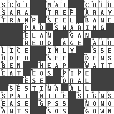 ACROSS 1. Native of Scotland 5. Floor covering 8. Having a low temperature 12. "Two Mules for Sister ____" 13. Unclean, religiously 15. Like ___ of sunshine 16. _____ steamer (cargo ship) 18. Sew up the eyelids of hawks and falcons 19. Object of repulsion 20. Groovy apt. 22. Catching in a trap 24. Flair 26. Separate the seeds from cotton 27. Do over again 28. Ripen 29. Wind 32. Louse (plural) 35. Inwardly 37. Compass dir. 38. Wrote a lyric poem 39. Perceive with the eye 40. Lairs 41. Benjamin's nick name 42. Pile 43. Electrical Unit 44. Consume 45. Greek goddess of the dawn 46. Corncob 49. Compass dir. 50. Taken by mouth 51. French poetic form 55. Everything 56. Petty quarrel 57. The longest river in the world 59. Attaches a signature 63. Relaxation 64. Global Positioning Systems (abbr.) 65. Words to Nanette 66. Pismires 67. Mayday 68. Long dress DOWN 1. Fast jet (abbr.) 2. 4-wheeled motor vehicle 3. Mouth or opening 4. ________ with (broke a safety seal) 5. Mountains (abbr.) 6. Ancient Greek god of war 7. Adolescent 8. Small house or cottage 9. NW Algerian seaport 10. Austrian-born American filmmaker Fritz 11. Color 14. Insipid 17. Light colored 21. June honoree 23. Actress Charlotte 25. Annoying sounds 28. City in Syria 29. Toward the sea 30. Is not 31. Repose 32. Ear part 33. The main thing one is thinking about 34. Penny 36. Teachers' org. 40. Residence 42. Weeding 45. Eastern Standard Time (abbr.) 47. Lyricist Gershwin 48. Friends 49. _____ Park, CO 51. Connect, as a bridge 52. 90 degrees 53. Cuts off 54. In addition 56. Ocean 58. Curvy letter 60. Thick or sticky substance 61. Compass dir. 62. Male offspring