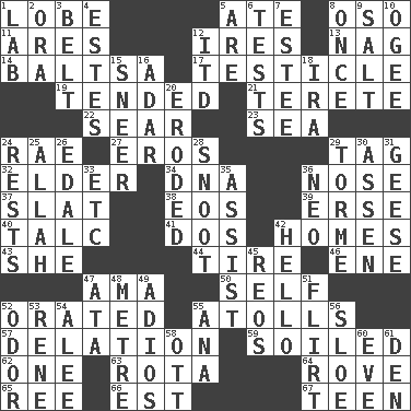 ACROSS 1. Ear part 5. Had dinner 8. Bear (Spanish) 11. Ancient Greek god of war 12. Angers 13. Tired old horse 14. Greek mezzo-soprano Agnes 17. A testis 19. Watched over 21. Cigar-shaped 22. Scorch 23. Ocean 24. Actress Charlotte 27. Greek god of love 29. Label 32. A person who is older than you are 34. Heredity factor (abbr.) 36. Sense of smell 37. Narrow board 38. Greek goddess of the dawn 39. Celtic language 40. Baby powder 41. Two (Sp.) 42. Dwellings 43. A female animal or person 44. Become fatigued 46. Compass dir. 47. Nanny (var.) 50. Automatic 52. Spoke pompously 55. Ringlike coral islands and reefs 57. Accusation by an informer 59. Dirtied 62. Single 63. Roll call or roster of names 64. Be footloose 65. Portuguese money of account (variant) 66. Eastern Standard Time (abbr.) 67. Adolescent DOWN 1. Experiment locale 2. Mouth or opening 3. Waist strap 4. _____ Park, CO 5. "We ___ not amused" (Victoria) 6. Trials 7. First name in cosmetics 8. At one time in the past 9. Table seasoning 10. Double curve, resembling the letter S 12. It would 15. Scornful expression 16. The sixth month of the Jewish calendar 18. Lyricist Gershwin 20. Eaten away 24. Musical pauses 25. Assad's deity 26. Peak District village in England 28. Snob 29. Singer Mel 30. NE Netherlands city 31. Honkers 33. And so on (abbr.) 35. Help 36. Modern: prefix 42. Phone greeting 45. Vintage cars 47. "One Day ___ Time" 48. Distance measurement (Brit.) 49. Goodbye (Sp.) 51. Seductive woman who exploits men 52. Aroma 53. French philosopher Descartes 54. Toward shelter 55. Santa ___, CA 56. _ gin 58. Baseball player Mel 60. Night before a holiday 61. Lair