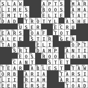 ACROSS 1. Cole _ (cabbage dish) 5. Flats, for short 9. Third mo. 12. Citrus fruits 14. Expressions of contempt or scorn 15. Wet nurse (var.) 16. Sends forth 17. Writer Wiesel 18. Make lace 19. Male parent 20. Trinitrotoluene 23. American tennis player Robert 24. One who uses or employs something 25. Shade of tan 27. Hearing organs 30. Clumsy lout 32. Small child 33. Toward shelter 34. Tumult 36. Commissioned mil. rank 38. Bar bill 39. Connecticut Ivy Leaguer 40. Choose 43. _ Lanka 46. Moist 48. Against 49. Greek goddess of the dawn 51. Friend of Pooh 52. Grant temporary use of 53. Patter 54. Proofreading order 56. Pull into pieces 58. Most capable 61. The 23rd letter of the Hebrew alphabet 64. Globe 65. Operatic vocal solo 66. Tarsus (plural) 68. Cards in a Roman deck? 69. 480, 500 or 516 sheets of paper 70. Satellite of Uranus 71. Car or cant ending 72. Celtic language 73. Frog relative DOWN 1. Downhill vehicle 2. Pale green bean 3. Among 4. Soggy 5. Collude with 6. Many (prefix) 7. Bathroom plumbing fixture 8. Compass dir. 9. Taiwanese island in East China Sea 10. Housemaid 11. Assign a rank or rating to 13. Fast planes 21. Vintage cars 22. Spoke pompously 23. Johnson of "Laugh-In" 24. Purpose 26. Gear tooth 27. Ingest 28. Insect wing 29. Confederate soldiers (slang) 31. Having threads 35. Full of chinks, cracks, or crevices 37. Words to Nanette 41. Parent Teacher Assoc. 42. Shallow baking pan 44. Hitchcock's "____ Window" 45. Electrically charged atom 47. Cooking vessels 48. The first octave above the treble staff 50. A viewer who gazes fixedly 53. Apartment or room in a ship 55. Singer James 56. Lacquered or enameled metalware 57. 4th largest of the Great Lakes 59. Prejudice 60. Unable to walk 61. Musical group of three 62. Toward the sea 63. Uncontrolled 65. "We ___ not amused" (Victoria) 67. Tate display