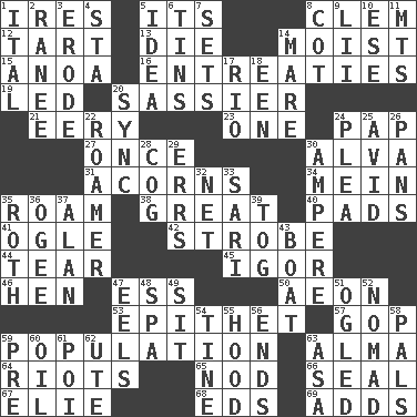 ACROSS 1. Angers 5. ___ a Wonderful Life 8. Clement's nick name 12. Small pie 13. Expire 14. Wet 15. Small Philippine buffalo 16. Pleas 19. Directed 20. More impudent 21. Suggestive of the supernatural 23. Single 24. Infant food 27. At one time in the past 30. Inventor's middle name 31. Oak nuts 34. Count _ (2 wds.) 35. Wander 38. Relatively large 40. Writing tablets 41. Stare 42. Disco prop 44. Pull apart 45. Composer Stravinsky 46. Layer 47. Curvy letter 50. Period of immesurable duration 53. Curse 57. Republican Party 59. Census information 63. _ mater 64. Debaucheries 65. Allow head to fall sleepily 66. Lick closed 67. Writer Wiesel 68. Begley and Asner 69. Does sums DOWN 1. Slanted text style (abbr.) 2. The wife of a rajah (variant) 3. Eat (away) 4. R.R. building 5. It may be bright or harebrained 6. Canisters 7. Puts into a specified state 8. Small bed 9. Cards in a Roman deck? 10. Compass dir. 11. Mountains (abbr.) 14. Female horse 17. _ de Janeiro 18. Car or cant ending 20. Synchronize (abbr.) 22. Nomad 24. Entreaty 25. Enthusiastic 26. Baking dishes 28. Gear tooth 29. Blunders 30. Electrical Unit 32. Remaining after all deductions 33. Indian skirt 35. Writer of Portnoy's Complaint (1969) 36. Double curve, resembling the letter S 37. ____ Jay Lerner 39. Coat; cloak 43. Water vessel 47. Snakelike fish 48. Health resort 49. Be seated 51. Stared 52. Roamer 54. Prong on a fork 55. Parka part 56. Conclusions 58. Friends 59. Before (prefix) 60. Lubricate 61. Luau course 62. Shoshoni 63. White ___ sheet