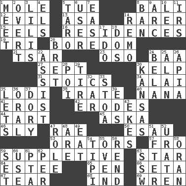 ACROSS 1. Undercover agent 5. Third day of the wk. 8. Indonesian resort city 12. Morally bad or wrong 13. White ___ sheet 14. More uncommon 15. Snakelike fish 16. Homes 19. Three (prefix) 20. Mood resulting from idleness 21. Russian ruler of old 23. Bear (Spanish) 24. Sound made by sheep 27. Back-to-school mo. 30. Seaweed 31. Unemotional ones 34. Jai _ 35. Farming town in central California 38. Feeling or showing extreme anger 40. Grandmother 41. Greek god of love 42. Eats (away) 44. Small pie 45. "____ silly question..." 46. Roguish 47. Actress Charlotte 50. Son of Isaac 53. Speakers 57. From 59. Supplementary 63. Play the lead 64. First name in cosmetics 65. Animal enclosure 66. Bristle 67. Pull apart 68. Working for oneself (abbr.) 69. Songbird DOWN 1. Confront 2. Unconcealed 3. Ms. Damita and namesakes 4. Raised railways 5. Pacific island yam 6. One who makes use of a thing 7. Comfort 8. Prohibit 9. Curve 10. Area sheltered from the wind 11. Big collection agency 14. San ____ (Riviera town) 17. Wedding promise 18. Two (Sp.) 20. Cy Young winner Saberhagen 22. Aid 24. Actor Lugosi 25. Actor Alda or Thicke 26. Capital of Western Samoa 28. Luau course 29. Hoop that covers a wheel 30. Sunflower state 32. Auto 33. Portico 35. Allows 36. Of the mouth 37. Rowboat 39. Begley and Asner 43. Makes supply last 47. Hero or heavy, e.g. 48. "We ___ not amused" (Victoria) 49. Erode 51. Following 52. A salt of uric acid 54. Native american tent (variation) 55. Baking chamber 56. Tear apart 58. NW Algerian seaport 59. Put into a specified state 60. Purpose 61. Parent Teacher Assoc. 62. For each 63. Compass dir.