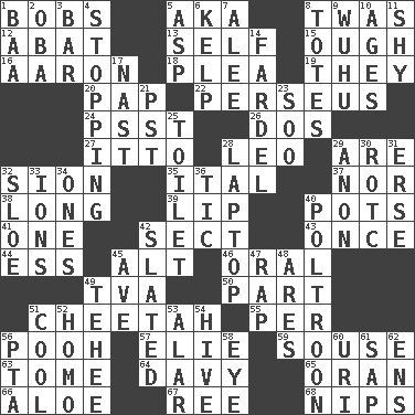 ACROSS 1. Moves up and down 5. Alias (abbr.) 8. It was, poetically 12. Blind as ____ 13. Automatically 15. Ending for "Through" and "Enough" 16. Composer Copland 18. Entreaty 19. Those people 20. Infant food 22. Son of Zeus who helped slay Medusa 24. Inconspicuous attention getter 26. Two (Sp.) 27. "Tell ____ the Marines!" 28. Lion 29. "We ___ not amused" (Victoria) 32. The Jewish people; Israel 35. Slanted text style (abbr.) 37. And not 38. Yearn 39. Mouth edge 40. Cooking vessels 41. Single 42. Religious group 43. At one time in the past 44. Curvy letter 45. Keyboard modifier key 46. Taken by mouth 49. Federal power corp. 50. Component 51. Leopard's kin 55. For each 56. "Silly old bear" 57. Writer Wiesel 59. Lush 63. Heavy book 64. American folk hero Crockett 65. NW Algerian seaport 66. Medicinal plant 67. Portuguese money of account (variant) 68. Cuts off DOWN 1. Sound made by sheep 2. Chief or king in Benin or Nigeria 3. Soap unit 4. Closing up, plugging up 5. Viper 6. Seaweed 7. Toward shelter 8. Lugs 9. Chinese city south-southwest of Nanjing 10. Ripens 11. Like a shrinking violet 14. Bundle 17. Political cartoonist Thomas 21. Pacific Standard Time (abbr.) 23. "Barney Miller" actor Jack 25. Bathroom 28. Portable computer 29. Soon (poet.) 30. College mil. group 31. Celtic language 32. _ gin 33. Charged particles 34. Washington bills 36. Nervous spasm 40. Coward 42. Scheduled 45. "___ Maria" 47. Reproach for some lapse or misdeed 48. Ancient Greek god of war 49. Giggle 51. Calm and collected 52. Like (prefix) 53. Having or resembling wings 54. Hub of activity 56. Parent Teacher Association (abbr.) 58. Sight organ 60. RI univ. 61. Plant excrement 62. Followers of ems