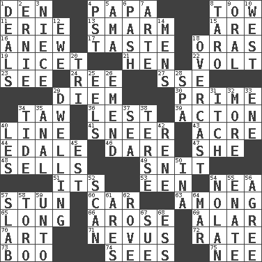 ACROSS 1. Lair 4. Dad 8. Pull behind 11. 4th largest of the Great Lakes 13. Excessive but superficial compliments 15. "We ___ not amused" (Victoria) 16. Afresh 17. Clothes sense 18. Mouths or openings 19. It is permitted: Lat. 21. Layer 22. Electrical Unit 23. Observe 24. To sift 27. Compass dir. 29. South Vietnam president (1954) 30. First class 34. The 23rd letter of the Hebrew alphabet 36. For fear that 39. NE Massachussets city 40. Actor's bit 41. Scornful expression 43. Measure of real estate 44. Peak District village in England 46. Have the gumption 47. A female animal or person 48. Makes a sale 49. In a ____ (agitated or irritated) 51. It is 53. Car or cant ending 54. Teachers' org. 57. Make senseless or dizzy 60. Automobile 63. Amid 65. Protracted 66. Came up 69. Having or resembling wings 70. Nonscientific branch of learning 71. Congenital growth or mark on the skin 72. Assign a rank or rating to 73. Sometimes accompanies a hiss 74. Observes 75. Born DOWN 1. Allots cards 2. Bert's buddy 3. Sibling's daughter 4. Pacific Standard Time (abbr.) 5. Wet nurse (var.) 6. Romantic infatuation 7. Johnson of "Laugh-In" 8. Edible starchy tuberous root 9. Relating to the mouth 10. 270 degrees 12. She-sheep 14. Not women's 18. Cloudy 20. Three (prefix) 25. Snakelike fish 26. Make improvements or corrections to 28. Health resort 29. Home 31. Hankering 32. Greater amount 33. Compass dir. 34. Periodic rise and fall of the sea level 35. Of or related to the anus 37. Ocean 38. Laconic 40. French article 42. French philosopher Descartes 45. Eastern Standard Time (abbr.) 50. _ tizzy (2 wds.) 52. Examine hastily 54. Pitcher Ryan 55. Maternal 56. Match 57. Thick slice 58. "Corrida" creature 59. To (old English) 61. Ancient Greek god of war 62. Be footloose 64. Impair 67. Take to court 68. Double-curved letter