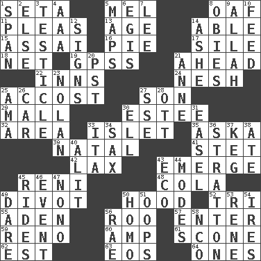 ACROSS 1. Bristle 5. Cartoonist voice _ Blanc 8. Clumsy lout 11. Entreaties 13. Mature 14. Competent 15. Slender Brazilian palm 16. Sliced dessert 17. Drop; flow; fall 18. Remaining after all deductions 19. Global Positioning Systems (abbr.) 21. Having the leading position 22. Lodging establishments 24. Tender 25. Buttonhole 27. Male child 29. Shopping center 30. First name in cosmetics 32. Length times width 33. Small island 35. "____ silly question..." 39. Relating to or accompanying birth 41. Proofreading order 42. Not strict 43. Develop 45. Painter Guido (1575-1642) 48. Root beer relative 49. A piece of turf (Scot.) 50. Parka part 52. Three (prefix) 55. Arabian gulf 56. Friend of Pooh 57. Keyboard key 59. Former U.S. Attorney General Janet 60. Electrical Unit 61. Biscuitlike quick bread 62. Eastern Standard Time (abbr.) 63. Greek goddess of the dawn 64. Singles DOWN 1. Connect, as a bridge 2. Otherwise 3. A testis 4. Auto club (abbr.) 5. Atlas contents 6. Armor plate that protects the chest 7. Area sheltered from the wind 8. Off-Broadway awards 9. Assad's deity 10. Nourish 12. Public displays of written messages 14. American tennis player Robert 20. Pacific Standard Time (abbr.) 21. Queen of England 1702-14 23. Pitcher Ryan 25. Nursemaid (var.) 26. 4-wheeled motor vehicle 27. Compass dir. 28. Baseball player Mel 30. Pipe bend 31. Artist's stand 33. Call ___ day 34. Saxophone 36. Ski resort town in Vermont 37. Barrel 38. Had dinner 40. Set down 43. Environmental prefix 44. Methods 45. Amusement-park features 46. Happening 47. Words to Nanette 49. Have the gumption 50. Like (prefix) 51. I made a mistake 53. French philosopher Descartes 54. Angers 56. Actress Charlotte 58. Non-commissioned officer (abbr.)
