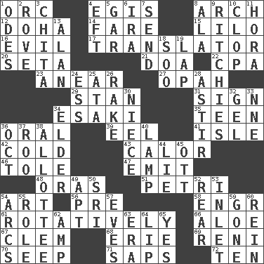 ACROSS 1. The grampus (Milton) 4. Armor plate that protects the chest 8. Bowlike part 12. Capital of the state of Qatar 14. Conductor's collection 15. _ and Stitch 16. Tending to cause great harm 17. Interpreter 20. Stalk of a moss capsule 21. ___ good deed 22. Numbers guy (abbr.) 23. Approach 27. Brightly colored fish 29. Comedian Laurel of Laurel & Hardy 31. Signal 34. 1973 Nobel Price Winner (Physics) Leo 35. Adolescent 36. Spoken 39. Snakelike fish 41. Capri or Wight 42. Having a low temperature 43. Bodily heat indicating an inflammation 46. Lacquered or enameled metalware 47. Send forth 48. Mouths or openings 51. _ dish (used to culture cells) 54. Nonscientific branch of learning 56. Before (prefix) 58. Engineer (abbr.) 61. Happening in regular succession 66. _ vera 67. Clement's nick name 68. One of the Great Lakes 69. Painter Guido (1575-1642) 70. Ooze 71. Plant excrements 72. "___ Little Indians" DOWN 1. Lyric poems 2. Be footloose 3. Riviera of "Kiss of the Spider Woman" 4. Lizard (obsolete) 5. Slender fish 6. Retirement account (abbr.) 7. Transmit 8. In the manner of 9. Actors Guy, Robert Welles, and Clint 10. Hoof sound 11. Israeli folk dance 13. Actor Alda or Thicke 18. "Barney Miller" actor Jack 19. Infant locale 24. Double-curved letter 25. _ moment's notice (2 wds.) 26. Libertine 28. Moving or stirring 30. Sibling's daughter 32. Set 33. Compass dir. 34. A person who is older than you are 36. Sep. follower 37. Friend of Pooh 38. One to whom something is allotted 40. Desk light 44. Whopper 45. Baseball player Mel 49. Fitting 50. _ Lanka 52. Tail end 53. An arm off of a larger body of water 54. Curves 55. Hero or heavy, e.g. 57. Nights before holidays 59. Went 60. It's straight from the horse's mouth 62. Electrical Unit 63. Epoch 64. Mouth edge 65. Consenting reply
