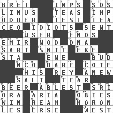 ACROSS 1. Cy Young winner Saberhagen 5. Naughty children 9. Distress signal 12. "_ and Lucy" (Charlie Brown theme song) 14. Afternoon social gatherings 15. Naughty child 16. More peculiar 17. Trial 18. Afternoon social gathering 19. Corporate head (abbr.) 20. Foolish or stupid persons 23. Transmitted 24. One who uses or employs something 25. Extremities 27. Independent ruler or chieftain 30. Dreamland 32. Heredity factor (abbr.) 33. Indian skirt 34. In a ____ (agitated or irritated) 36. Supplement with great effort 38. R.R. building 39. Compass dir. 40. Partially opened flower 43. Non-commissioned officer (abbr.) 46. Have the gumption 48. ____ d'Azur (French Riviera) 49. Part of HMS, perhaps 51. Marina Del _, California 52. Afresh 53. Table seasoning 54. Lacerate 56. Fermented drink made from hops 58. Most capable 61. _ Lanka 64. Mouth or opening 65. Roberta Peters solo 66. Off-Broadway awards 68. Acquire through effort 69. 480, 500 or 516 sheets of paper 70. Person of subnormal intelligence 71. French article 72. Celtic language 73. Compass direction DOWN 1. Group of countries in special alliance 2. Travel on an animal 3. Inside; within (prefix) 4. Third day of the wk. 5. "Tell ____ the Marines!" 6. Confront 7. Went by 8. Fast jet (abbr.) 9. Locates 10. Sign of things to come 11. Argument over a trivial matter 13. Indian titles of respect 21. Lairs 22. Pressed 23. Neighbor of Neb. 24. RI univ. 26. Compass dir. 27. Double-curved letter 28. Floor protector 29. SW Asia republic 31. Middle Eastern gold or silver currency 35. Cylindrical with tapered ends 37. Inky black, to poets 41. Shoshoni 42. Morning condensation 44. Burn to charcoal 45. Lubricate 47. Snake ____ (dice throw) 48. Auto 50. A viewer who gazes fixedly 53. Actors Connery and Penn 55. Smallest unit of an element 56. Soup holder 57. 4th largest of the Great Lakes 59. Prejudice 60. Unable to walk 61. Male parent of an animal 62. Vintage cars 63. Is not 65. "We ___ not amused" (Victoria) 67. Ribbon knot