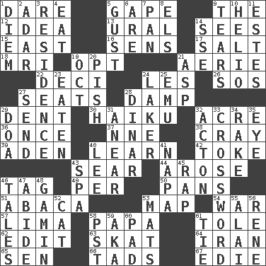 ACROSS 1. Have the gumption 5. Stare wonderingly 9. Definite Article 12. It may be bright or harebrained 13. Mountain range 14. Perceives with the eye 15. 90 degrees 16. Elected reps. 17. Table seasoning 18. Medical imaging device (abbr.) 19. Choose 21. Nest on high 22. Tenth: prefix 24. French article 26. Distress signal 27. Theater features 28. Moist 29. Undesirable depression on a surface 30. Japanese verse 32. 43,560 square feet 36. At one time in the past 37. Compass dir. 38. Supercomputer manufacturer 39. Arabian gulf 40. Acquire or gain knowledge or skills 42. Puff or smoke 43. Burn superficially 44. Came up 46. Label 49. For each 50. Zero-star reviews 51. Phillipine bananalike plant 53. Atlas unit 54. Armed conflict 57. Pale green bean 58. Dad 61. Lacquered or enameled metalware 62. Prepare for publication 63. Three-handed card game 64. SW Asia republic 65. Elected rep. 66. Small boys 67. Singer Brickell DOWN 1. South Vietnam president (1954) 2. The sixth month of the Jewish calendar 3. Home 4. Consume 5. Abrupt rush of wind 6. "We ___ not amused" (Victoria) 7. Baking dish 8. Raised railways 9. Lacerates 10. Sun: prefix 11. _____ Park, CO 14. Compass dir. 19. Sep. follower 20. Expression of disdain 21. Cleo's killer 23. Consumed 24. Member of a famous L.A. basketball team 25. Australian flightless bird 27. Transmit 28. Middle Eastern gold or silver currency 29. ___ good deed 31. Approach 32. Gambison 33. What you're doing now 34. Libertine 35. Sight organ 40. Area sheltered from the wind 41. California wine valley 43. Health resort 45. Strike 46. Lies 47. Remain 48. Street urchin 52. Feline 53. Floor coverings 55. Mountain range southwest of Kyrgyzstan 56. French philosopher Descartes 58. Pacific Standard Time (abbr.) 59. Alias (abbr.) 60. Groovy apt. 61. Make a knot