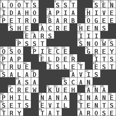 ACROSS 1. Plunders 6. Fast jet (abbr.) 9. Elected rep. 12. Potato state 13. Capital of Western Samoa 14. Hub of activity 15. Stone: prefix 16. Sharp remark 17. Double curve, resembling the letter S 18. A female animal or person 19. 43,560 square feet 20. Coop moms 21. Hearing organs 23. One more than two 24. Inconspicuous attention getter 25. Frozen precipitation (plural) 28. Bear (Spanish) 30. Component 34. Jennifer or Joel 35. Infant food 36. A person who is older than you are 38. ___ a Wonderful Life 39. Loyal 41. Small island 43. Eastern Standard Time (abbr.) 44. First course 46. Advice 48. White ___ sheet 49. Examine minutely or intensely 50. Ship's personnel 51. Malaysian steamed pastry 53. Santa ___, CA 56. Silvers or Donahue 57. Nanny 58. Silly 60. Arranges properly for use 61. Tending to cause great harm 62. Portable shelters 63. Attempt 64. Make lace 65. Came up DOWN 1. Mouth edge 2. Lyric poems 3. Pledge 4. Trios 5. "Barney Miller" actor Jack 6. Coast Guard woman 7. The founder of a family 8. Keyboard key 9. Seigniories (variant) 10. Nights before holidays 11. Born 13. Lettered men learn these first 14. Cultivating 19. Nick name for Arthur 20. Part of HMS, perhaps 22. Viper 24. Teen's desire 26. Soaks 27. System (abbr.) 28. Elects 29. "Two Mules for Sister ____" 31. Biblical high priest 32. Music discs 33. Snakelike fish 37. Arrive at 40. Artist's stands 42. Federal power corp. 45. Fool 47. Sillier 49. Lick closed 50. "Mermaids" star 51. Polynesian shrub of the pepper family 52. A single undivided whole 54. Billionth: prefix 55. Pismires 56. Pacific Standard Time (abbr.) 57. Fish or hair follower 58. Call ___ day 59. Compass dir.
