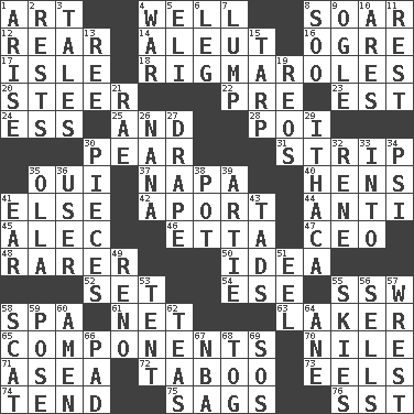 ACROSS 1. Tate display 4. Not ill 8. Fly high 12. Located in or toward the back 14. Native American of Southwest Alaska 16. Legendary monster 17. Small island 18. Complicated, petty procedures 20. Bull 22. Before (prefix) 23. Eastern Standard Time (abbr.) 24. Curvy letter 25. Plus 28. Luau course 30. Lightbulb-shaped fruit 31. Long narrow piece of something 35. Fr. "Yes" 37. California wine valley 40. Coop moms 41. Otherwise 42. To the left, to Queeg 44. Against 45. Actor Baldwin 46. Singer James 47. Corporate head (abbr.) 48. Less widely known 50. The content of cognition 52. Put into a specified state 54. Compass dir. 55. Compass dir. 58. Health resort 61. Fish or hair follower 63. Member of a famous L.A. basketball team 65. Parts 70. The longest river in the world 71. Toward the sea 72. Off limits 73. Snakelike fish 74. Look after 75. Droops 76. Fast jet (abbr.) DOWN 1. Get up 2. Musical pauses 3. Stories 4. Armed conflict 5. Connecticut Ivy Leaguer 6. Part of a journey 7. Mass 8. "Barney Miller" actor Jack 9. Stare 10. Ancient Greek god of war 11. State of inaction 13. To sift 15. Canvas cover 19. Vintage cars 21. Actress Charlotte 26. Nanny 27. Window treatment 29. New York city 30. Parts 32. French philosopher Descartes 33. To the inside or interior of 34. 23rd letter of the Greek alphabet 35. Rounded earthenware pot or jar 36. One who makes use of a thing 38. Plant holder 39. Nick name for Arthur 41. Ewer handle 43. Small amounts or degrees 49. Western Nevada city 51. Snakelike fish 53. Portable shelter 55. Atmospheres 56. Makes a sale 57. Obtain by seizing forcibly or violently 58. Go away! 59. Introduce or present, as a question 60. So be it 62. Beverages made from leaves 64. One (Scot) 66. Groovy apt. 67. Basketball assoc. 68. Coat; cloak 69. Mayday