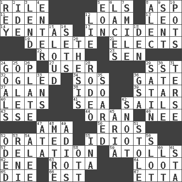 ACROSS 1. Cause heat under the collar 5. Raised railways 8. Cleo's killer 11. Paradise 12. Rich soil 13. Lion 14. Gossips 17. Event 19. Erase 21. Chooses 22. Writer of Portnoy's Complaint (1969) 23. Elected rep. 24. Grand Old Party 27. One who makes use of a thing 29. Fast jet (abbr.) 32. Stared 34. Mayday 36. Yard entry 37. ____ Jay Lerner 38. Wedding promise 39. Play the lead 40. Allows 41. Ocean 42. Travels by water 43. Compass dir. 44. Northwest Algerian city 46. Born 47. Nursemaid (var.) 50. Greek god of love 52. Declaimed 55. Foolish or stupid persons 57. Accusation by an informer 59. Ringlike coral islands and reefs 62. Compass dir. 63. Roll call or roster of names 64. Spoils 65. Expire 66. Eastern Standard Time (abbr.) 67. Singer James DOWN 1. Marina Del _, California 2. Binary compound 3. Grant temporary use of 4. Keyboard key 5. A really long time 6. Shoestrings 7. Grin 8. Actor Baldwin 9. Posted 10. Plant holders 12. Falsehood 15. Verbally 16. Arranges properly for use 18. Lair 20. College paper 24. Scores awarded for successful feats 25. Stares 26. Food holder 28. Cowboy competition 29. Smooth fabric 30. Having lost freshness 31. Laconic 33. Followers of ems 35. Flew 36. Girls' org. (abbr.) 42. Snob 45. Operatic vocal solo 47. "One Day ___ Time" 48. Distance measurement (Brit.) 49. Goodbye (Sp.) 51. Fur scarf 52. Wrote a lyric poem 53. Painter Guido (1575-1642) 54. Toward shelter 55. _ tizzy (2 wds.) 56. Notch 58. Baseball player Mel 60. Car dealer's back yard 61. R.R. building