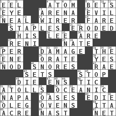 ACROSS 1. Snakelike fish 4. Smallest unit of an element 8. Wagers 12. Sight organ 13. Sports stadium 14. Morally bad or wrong 15. Actress Patricia 17. One who wires 18. Conductor's collection 19. Paper fasteners 21. Worn away 23. Part of HMS, perhaps 24. Area sheltered from the wind 26. "We ___ not amused" (Victoria) 27. Painter Guido (1575-1642) 28. Nathan's nickname 30. For each 31. Break 34. Definite Article 37. Compass dir. 38. Speak pompously 39. It is so 40. Allow head to fall sleepily 41. Sounds asleep 42. Actress Charlotte 43. Puts into a specified state 44. Halt 46. Pass on 47. Followers of ems 50. Nervous spasm 51. Ringlike coral islands and reefs 54. Pertaining to the sea 57. California wine valley 58. Fertile tracts in a desert 60. Singer Brickell 62. Cassini of fashion 63. Baking chambers 64. Call ___ day 65. Measure of real estate 66. Political cartoonist Thomas 67. Fish or hair follower DOWN 1. Car or cant ending 2. Sight organs 3. Resembling or made to resemble leather 4. Satellite of Uranus 5. Laconic 6. Single 7. Female horse 8. Prior to 9. Elude 10. Hoop that covers a wheel 11. Downhill vehicle 13. Leather borer 16. (Had) reclined 20. Air pressure measure (abbr.) 22. Assign a rank or rating to 25. Maternal 27. Western Nevada city 29. Matures 30. Fenced enclosure 31. Do not 32. Came up 33. Spoil 34. Polypeptide antibiotic 35. Pile 36. Compass dir. 41. Stitch closed the eyes of (a falcon) 43. Fodder prepared in a silo 44. R.R. building 45. Prong on a fork 46. Drug addict 48. Olfactory organs 49. Aroma 51. Small Philippine buffalo 52. Baby powder 53. Within a short period 55. Curvy letter 56. Quote 59. Actress Gardner 61. Erode
