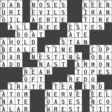 ACROSS 1. Apply (a substance) by light strokes 4. Olfactory organs 9. Peachy ____! 13. RI univ. 14. Vices 15. SW Asia republic 16. Petroleum 17. Nest on high 18. Hoop that covers a wheel 19. Everything 21. To riddle 22. _____ Park, CO 24. Water vessel 26. Had dinner 27. Hold, grip (Informal) 29. Comedian Laurel of Laurel & Hardy 30. Memphis, Tenn. Street 31. Prong on a fork 33. Police officer (slang) 36. Soap unit 37. Inhabiting a nest 40. Chief or king in Benin or Nigeria 41. Find the sum of 42. Political cartoonist Thomas 43. ID or VA city 45. Bring up, as a child 47. Drinks excessively 48. Often (poetically) 49. Do over again 50. Feeling or showing extreme anger 52. Beverage made from leaves 54. Conclude 56. Tiny particle 57. Boldness 59. Snakelike fish 61. Nathan's nickname 62. Fertile tracts in a desert 63. Non-commissioned officer (abbr.) 64. Having or resembling wings 65. Take or capture by force 66. Teat (slang) DOWN 1. Superhero pair 2. Operatic vocal solo 3. Big road sign 4. Teachers' org. 5. Unconcealed 6. Beget 7. Writer Wiesel 8. Compass dir. 9. Baby cat 10. 4th largest of the Great Lakes 11. Hearing organs 12. Compass dir. 20. Hang loosely or laxly 22. Ingested 23. R.R. building 25. Arabian gulf 27. Swedish rock group 28. Froth on beer 29. In a ____ (agitated or irritated) 31. Russian ruler of old 32. It is 33. Part 34. Mitch Miller's instrument 35. Zero-star reviews 38. Maternal 39. Yard entry 44. Method 45. Wanderer 46. Bank Draft (abbr.) 49. All-night dance parties 50. Slanted text style (abbr.) 51. Round or rotation of duties 52. Rend 53. Celtic language 55. Tenth: prefix 56. Santa ___, CA 57. Immediately 58. Eastern Standard Time (abbr.) 60. Car dealer's back yard