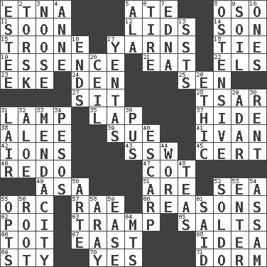 ACROSS 1. Inactive volcano in Sicily 5. Had dinner 8. Bear (Spanish) 11. Within a short period 12. Hats (slang) 14. Manchild 15. Marketplace scale 17. Tall tales 18. Standoff 19. Substance 21. Consume 22. Raised railways 23. Make supply last 24. Lair 25. Elected rep. 27. Be seated 28. Russian ruler of old 31. Desk light 35. Infant locale 37. Flintstone garb 38. Toward shelter 39. Take to court 41. _ the terrible 42. Charged particles 43. Compass dir. 45. Certainty 46. Do over again 47. Small bed 49. White ___ sheet 51. "We ___ not amused" (Victoria) 52. Ocean 55. The grampus (Milton) 57. Actress Charlotte 60. Thinks logically 62. Luau course 63. _____ steamer (cargo ship) 65. Table seasonings 66. Small child 67. 90 degrees 68. The content of cognition 69. Filthy place 70. It is so 71. Dormintory (informal) DOWN 1. First name in cosmetics 2. Cod relative 3. Trap for birds or small mammals 4. Singer Murray 5. Chicken ___ king 6. Become fatigued 7. Pulitzer Prize-winning author Ferber 8. Clearly or manifestly demonstrative 9. Earth 10. Singles 13. Fast planes 16. Conclusions 17. Gossips 20. To provide with a ceiling 26. Moral principle 29. The sixth month of the Jewish calendar 30. Monthly bill 31. Den 32. _ vera 33. Ananias' fault 34. Mexican monetary units 36. Fluid product of inflammation 40. Fortification 44. Had on 48. Beverages made from leaves 50. Johnson of "Laugh-In" 52. Twentieth part of a lira 53. Keyboard key 54. Indian state 55. Elects 56. Carrot, for example 58. Like ___ of sunshine 59. Relaxation 61. Stated 64. Mountains (abbr.)