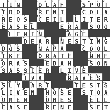 ACROSS 1. Shallow baking pan 4. Norwegian king 8. Specific locale 12. Wedding promise 13. Painter Guido (1575-1642) 14. Root beer relative 15. Vintage cars 17. To provide with a ceiling 18. 61 cubic inches 19. Artist's stand 21. Epoch 23. "Barney Miller" actor Jack 24. Soviet premier 1918-24 26. Grow older 28. Letter starter 30. Nestling 34. Two (Sp.) 37. California wine valley 39. Calm and collected 40. Eisenhower's nickname 41. Declaim 43. Compass dir. 44. Mouths or openings 46. Dutch treat 47. Male offspring 48. More lively and spirited 51. Not recorded 54. Federal power corp. 55. All-night dance parties 58. Mischievous 61. Tate display 63. Trials 65. Make or become more lively 67. Flexible conduit 71. Portico 72. Sign of something about to happen 73. Singles 74. Pipe bend 75. Relaxation 76. French philosopher Descartes 77. Put into a specified state DOWN 1. Hoop that covers a wheel 2. Standard of perfection 3. Trap for birds or small mammals 4. The grampus (Milton) 5. Area sheltered from the wind 6. Black tropical American cuckoo 7. Do some clerical work 8. _-fi 9. Plant holders 10. Margarine 11. Pacific island yam 16. Post 18. Fails to keep up a pace 20. Falsehood 22. Actress Charlotte 25. Billionth: prefix 27. And so on (abbr.) 29. More uncommon 30. Relating to or accompanying birth 31. Charged atoms 32. Words to Nanette 33. Small, secluded valley 34. "Vaya con ____" 35. Gumbo ingredient 36. Oceans 38. Writing tablet 42. Independent ruler or chieftain 45. Fast jet (abbr.) 49. _ the terrible 50. Hearing organ 52. Large container 53. Nights before holidays 56. _____ Park, CO 57. Fur scarf 58. _ gin 59. Pale green bean 60. Jacques Cousteau's middle name 62. Son of Odin 64. Table seasoning 66. Compass dir. 68. Single 69. Elected rep. 70. Compass dir.