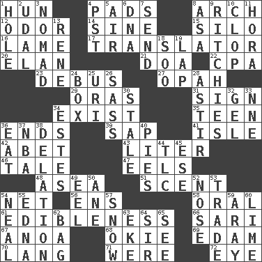 ACROSS 1. Attila the _ 4. Writing tablets 8. Bowlike part 12. Scent 14. Trig term 15. Grain storage tower 16. Unable to walk 17. Interpreter 20. Flair 21. ___ good deed 22. Tax preparer (abbr.) 23. Alight from a bus 27. Brightly colored fish 29. Mouths or openings 31. Signal 34. Have an existence 35. Adolescent 36. Extremities 39. Plant excrement 41. Small island 42. Collude with 43. 61 cubic inches 46. Story 47. Snakelike fish 48. Toward the sea 51. Odor 54. Fish or hair follower 56. Followers of ems 58. Taken by mouth 61. The property of being fit to eat 66. Indian skirt 67. Small Philippine buffalo 68. Migrant worker of the '30s 69. Dutch treat 70. Austrian-born American filmmaker Fritz 71. Past tense of be (plural) 72. Sight organ DOWN 1. Opening into or through something 2. Allodial 3. Wanderer 4. Pacific Standard Time (abbr.) 5. Atmosphere 6. Heredity factor (abbr.) 7. Post 8. White ___ sheet 9. Actors Guy, Robert Welles, and Clint 10. Hoof sound 11. Israeli folk dance 13. French philosopher Descartes 18. "Barney Miller" actor Jack 19. Pet locale 24. Gift holder 25. RI univ. 26. Backtalk 28. Being in motion 30. Having lost freshness 32. Set 33. Compass dir. 34. _____ Park, CO 36. Consume 37. Basketball assoc. 38. Conveyance 40. Sliced desserts 44. Affectionate concern, for short 45. Compass dir. 49. Snakelike fish 50. One (Scot) 52. Sense of smell 53. Exchange 54. Anneal 55. Pulitzer Prize-winning author Ferber 57. Overwhelm 59. Like ___ of sunshine 60. Citrus frut 62. Paper or plastic container 63. Supplement with great effort 64. Title for a knight 65. Observe