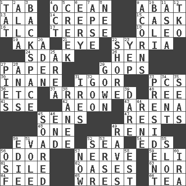 ACROSS 1. Bar bill 4. Sea 9. Blind as ____ 13. Chicken ___ king 14. Streamer paper 15. Keg 16. Affectionate concern, for short 17. Laconic 18. Butter sub 19. Alias (abbr.) 21. Sight organ 22. Damascus' land 24. Neighbor of Neb. 26. Layer 27. Some stationery 29. Republicans 30. Lacking in sense or substance 31. Russian composer Stravinsky 33. Personal Computers (abbr.) 36. And so on (abbr.) 37. Moved like an arrow 40. To riddle 41. Compass dir. 42. Period of immesurable duration 43. Sports stadium 45. Elected reps. 47. Musical pauses 48. Single 49. Painter Guido (1575-1642) 50. Elude 52. Ocean 54. Begley and Asner 56. Scent 57. Boldness 59. Biblical high priest 61. Drop; flow; fall 62. Fertile tracts in a desert 63. And not 64. Nourish 65. Obtain by seizing forcibly or violently 66. Afternoon social gathering DOWN 1. Make lace 2. Silent film actress Nazimova 3. Keyboard key 4. Sep. follower 5. Small stream 6. Suggestive of the supernatural 7. Domed church section 8. Born 9. Oak nuts 10. Indonesian resort city 11. At sea 12. Ring climax 20. Arabian gulf 22. Dinah or Pauly 23. Slangy assent 25. Type of rug 27. Sliced desserts 28. Pismires 29. Woman's formal wear 31. Angers 32. Thick or sticky substance 33. Elected leader of a country 34. Penny 35. Oceans 38. Indian princess (variant) 39. Have the gumption 44. French philosopher Descartes 45. Flew 46. Conclude 49. All-night dance parties 50. Singer Brickell 51. Grand slam 52. Scorch 53. Celtic language 55. _ gin 56. Order of Saint Francis (abbr.) 57. Immediately 58. Eastern Standard Time (abbr.) 60. Lyricist Gershwin