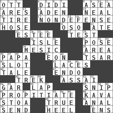 ACROSS 1. Baseball player Mel 4. "You Light Up My Life" star Conn 8. Toward the sea 12. Ancient Greek god of war 14. Arabian gulf 15. Actress Patricia 16. Hoop that covers a wheel 17. Unrelated to defense, as in spending 20. Stockings 21. Bear (Spanish) 22. Had dinner 23. First name in cosmetics 27. Trial 29. Capri or Wight 31. Introduce or present, as a question 34. Of or pertaining to a meson 35. Type of rug 36. Dad 39. A really long time 41. Russian ruler of old 42. Narrow opening 43. Shoestrings 46. Story 47. Inside; within (prefix) 48. Long journey 51. Slender Brazilian palm 54. Slender fish 56. Infant locale 58. Clip 61. Conciliate 66. Polynesian shrub of the pepper family 67. Portico 68. Loyal 69. Of or related to the anus 70. Post 71. The bottom of a shoe or boot 72. Followers of ems DOWN 1. Pledge 2. Musical group of three 3. Laconic 4. Daniel's nick name 5. Wedding promise 6. Lair 7. _ china 8. One (Scot) 9. Elected representatives 10. Compass direction 11. Toward shelter 13. Observes 18. Eastern Standard Time (abbr.) 19. Enemy 24. Neckwear 25. Double-curved letter 26. Writer Wiesel 28. Arguments over trivial matters 30. Learning spot: Fr. 32. Ocean 33. Hearing organ 34. Mother 36. Pacific Standard Time (abbr.) 37. In the manner of 38. Characterized by complete cowardliness 40. Grandmother 44. Music discs 45. Greek goddess of the dawn 49. Biblical high priest 50. Krazy ___ of comics 52. "____ silly question..." 53. Lacking in sense or substance 54. Global Positioning Systems (abbr.) 55. Johnson of "Laugh-In" 57. Essential or central part 59. _ the terrible 60. Friends 62. Writing tablet 63. "We ___ not amused" (Victoria) 64. Third day of the wk. 65. Snakelike fish
